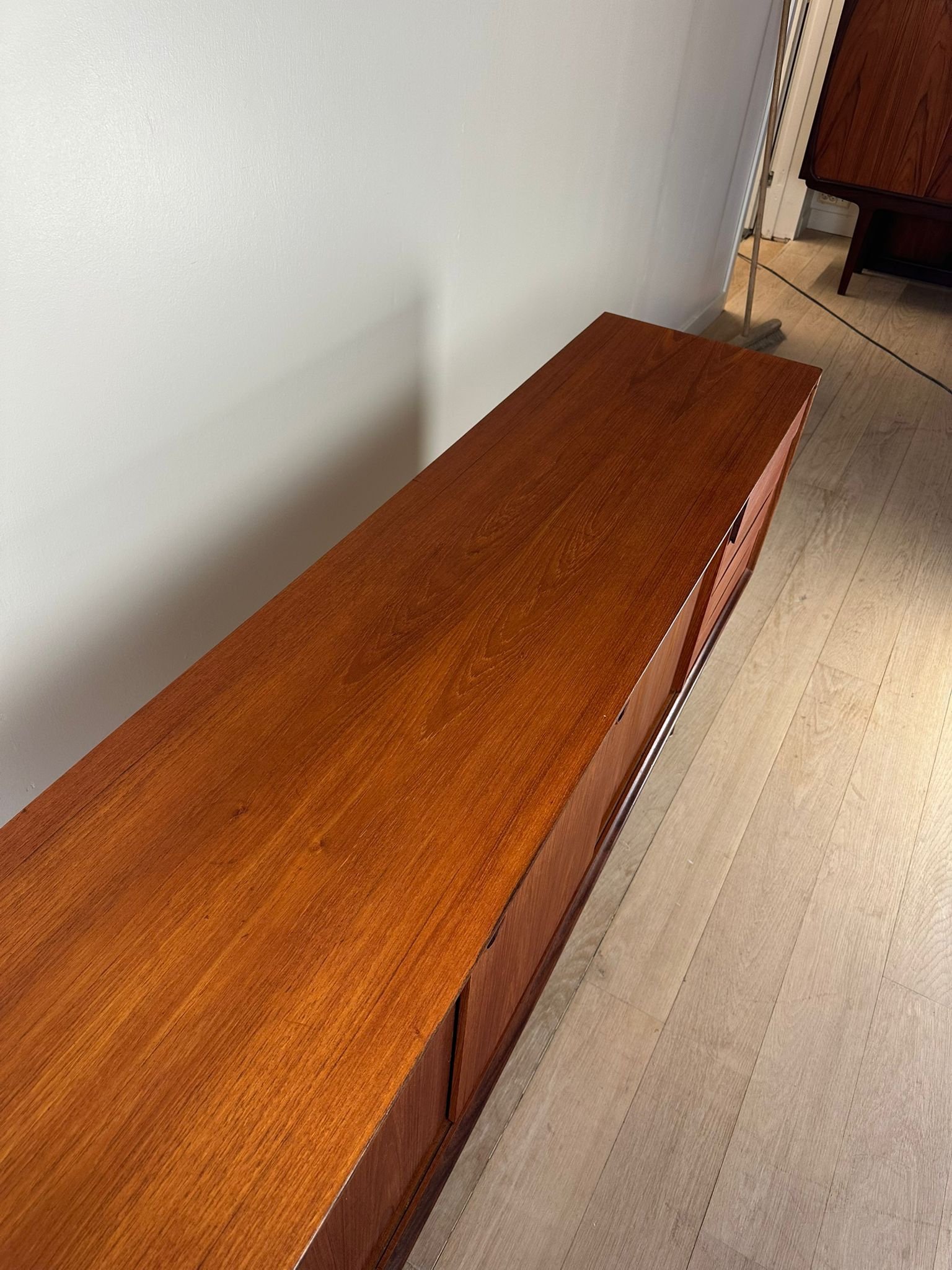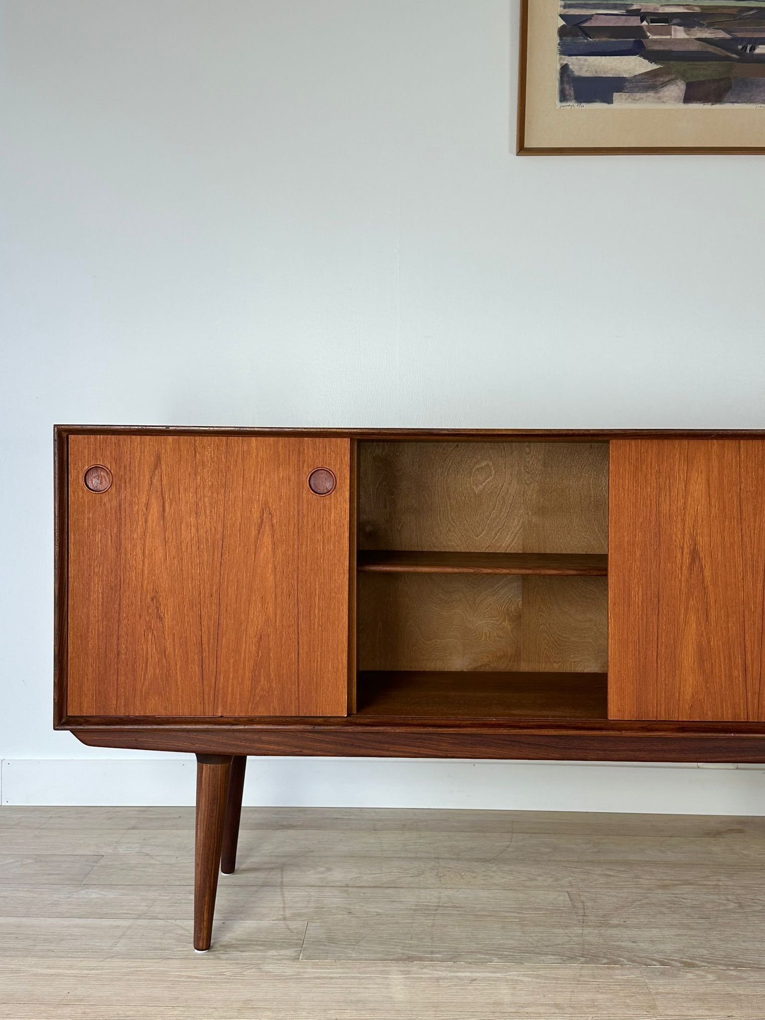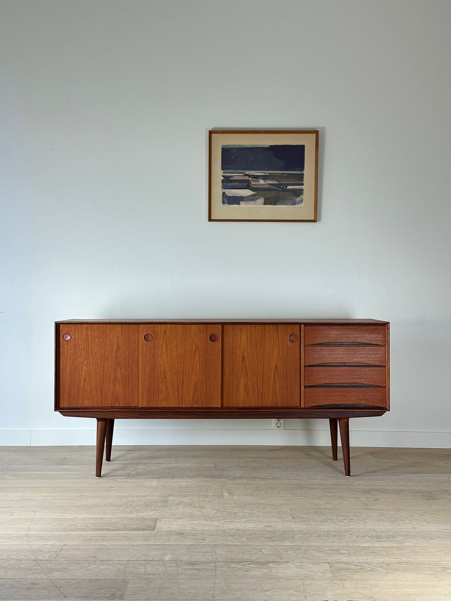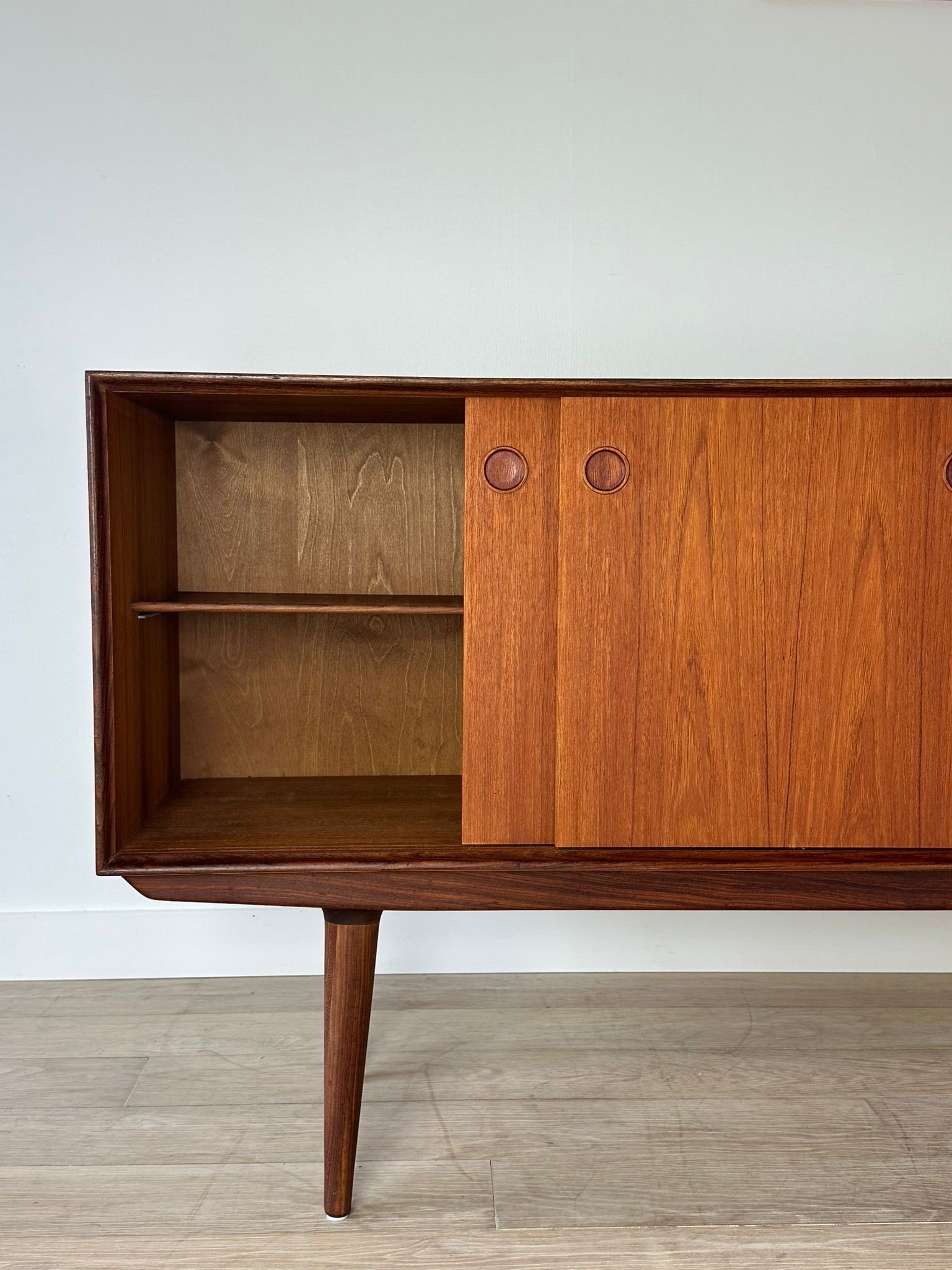 A stylish Scandinavian teak sideboard featuring beautiful round handles, three sliding doors, and four drawers. The clean lines and warm wood tone highlight the best qualities of 1960s Nordic design – timelessness, quality, and functionality.