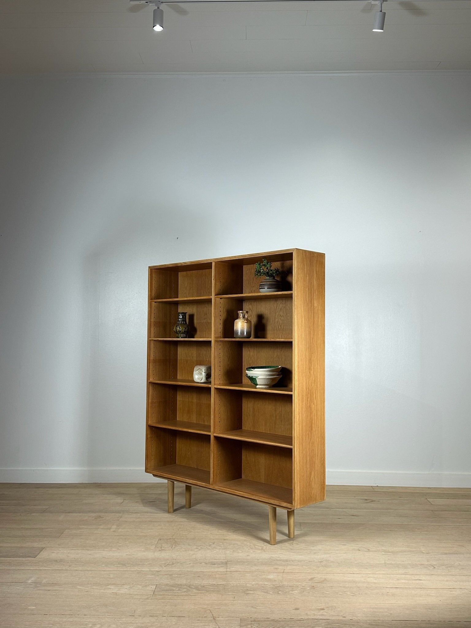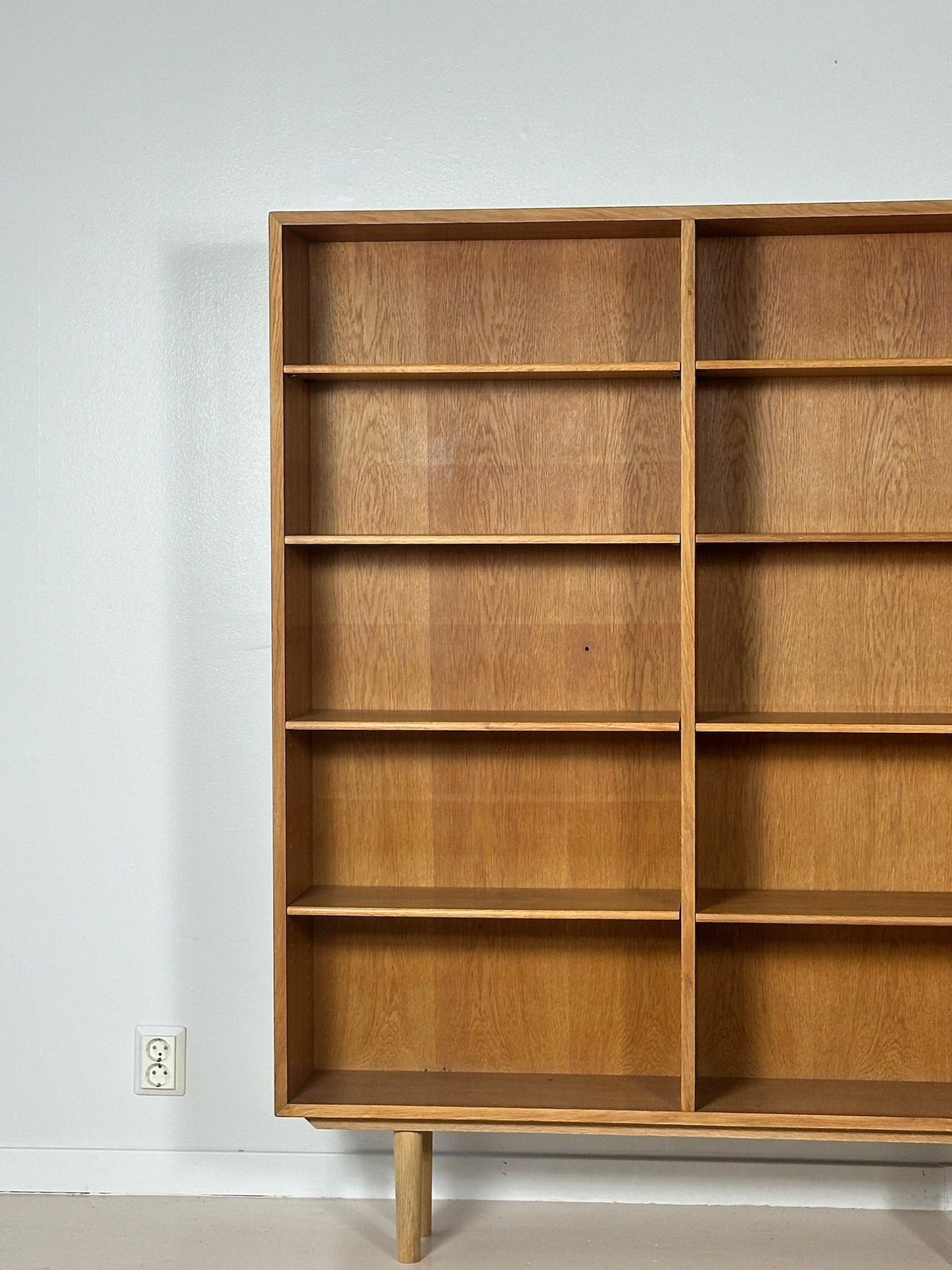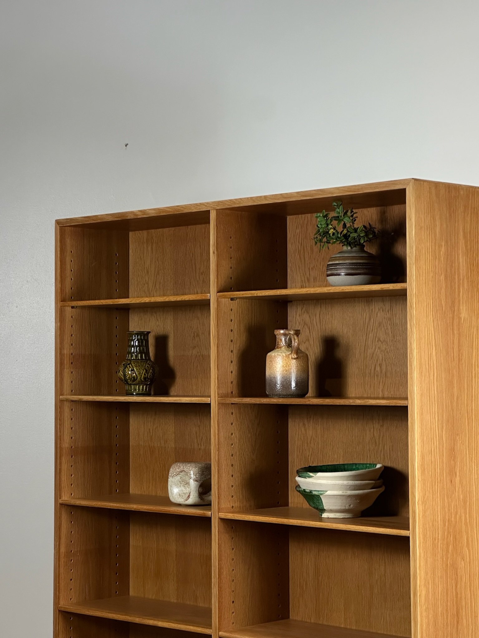 A tall Danish bookcase in light oak designed by Børge Mogensen, featuring adjustable shelves. In excellent condition.