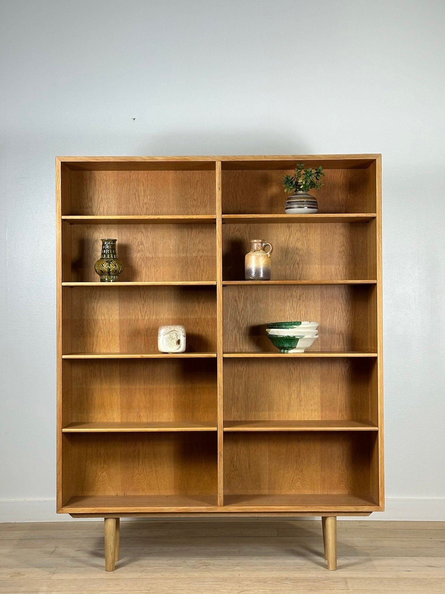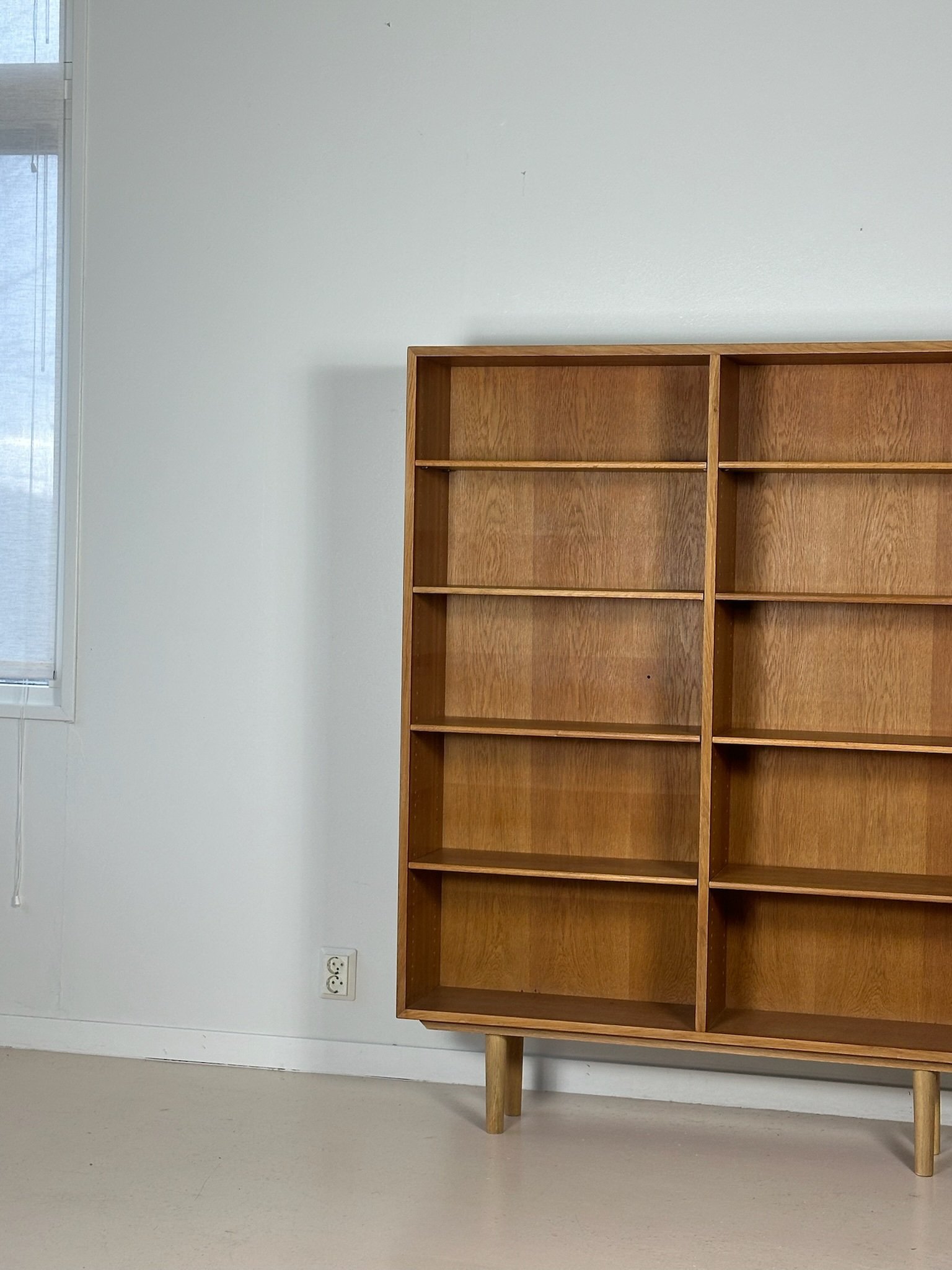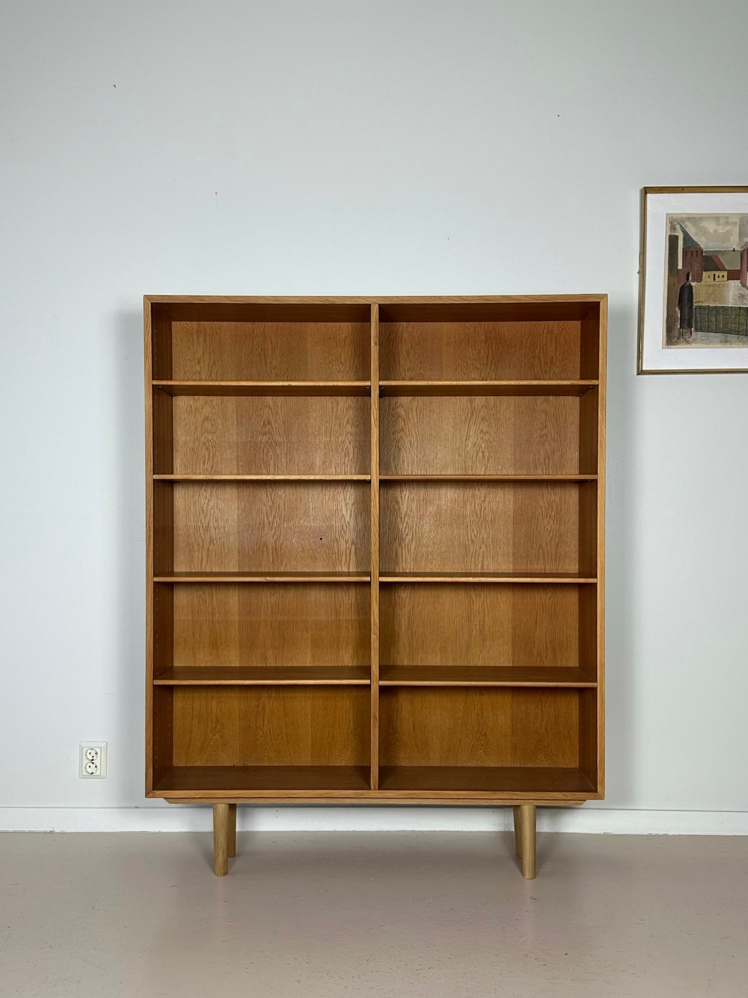 A tall Danish bookcase in light oak designed by Børge Mogensen, featuring adjustable shelves. In excellent condition.