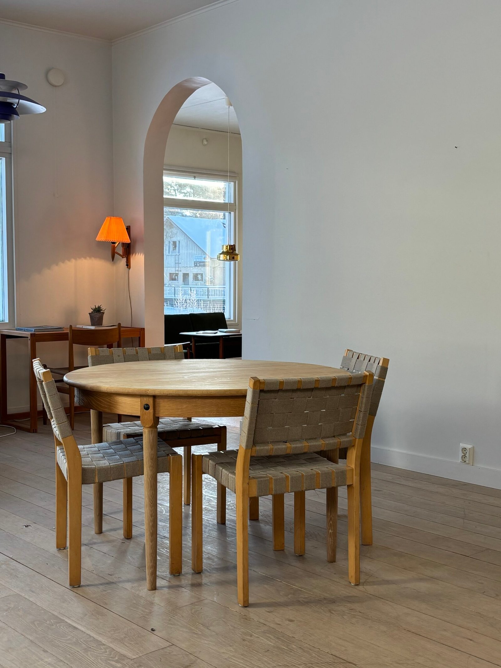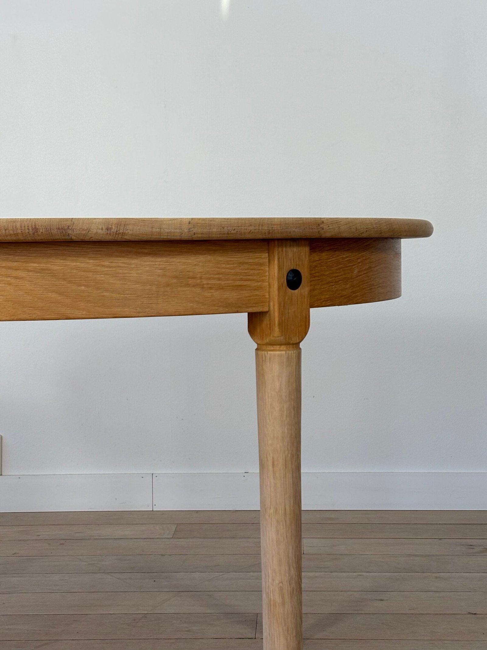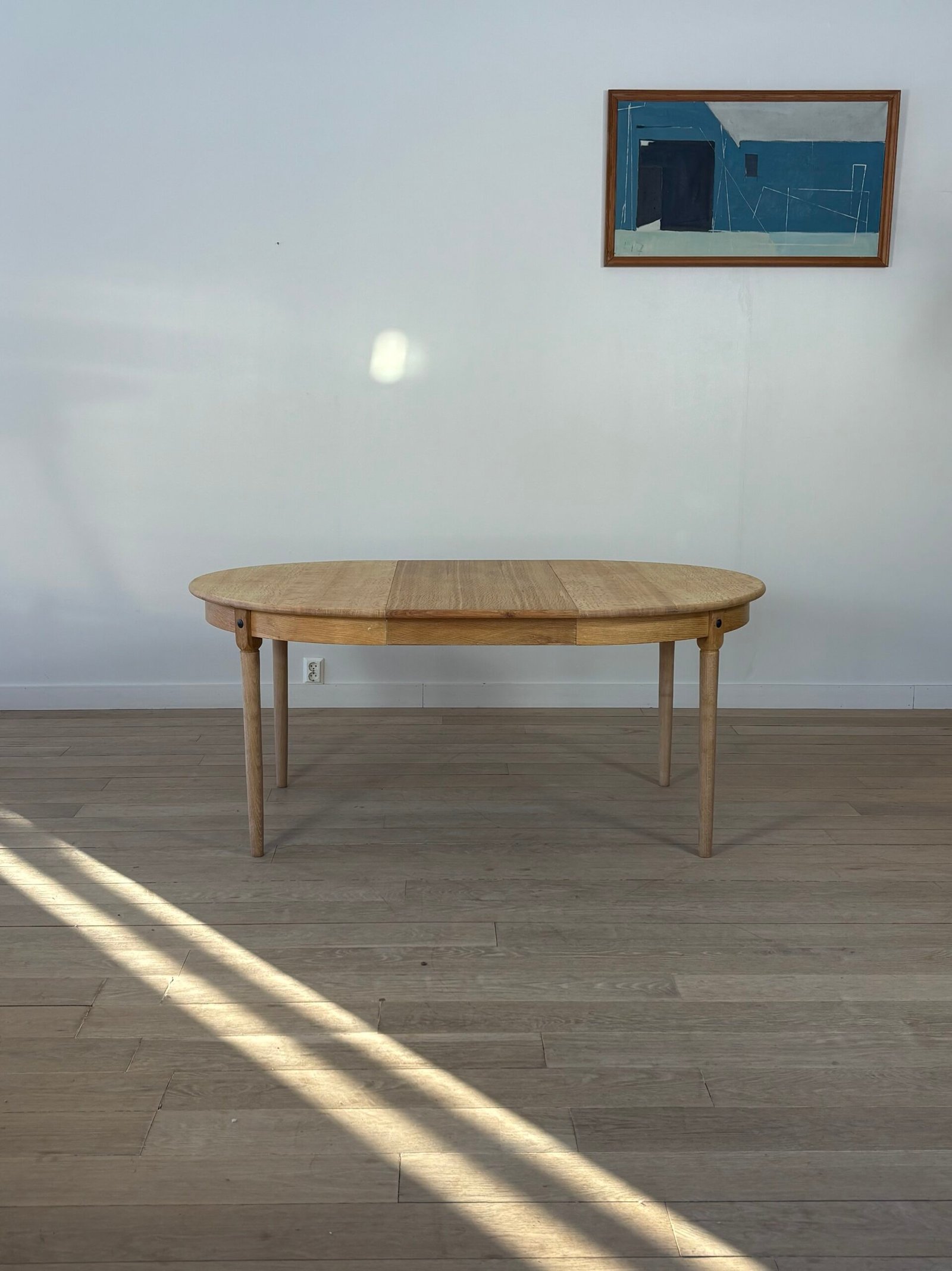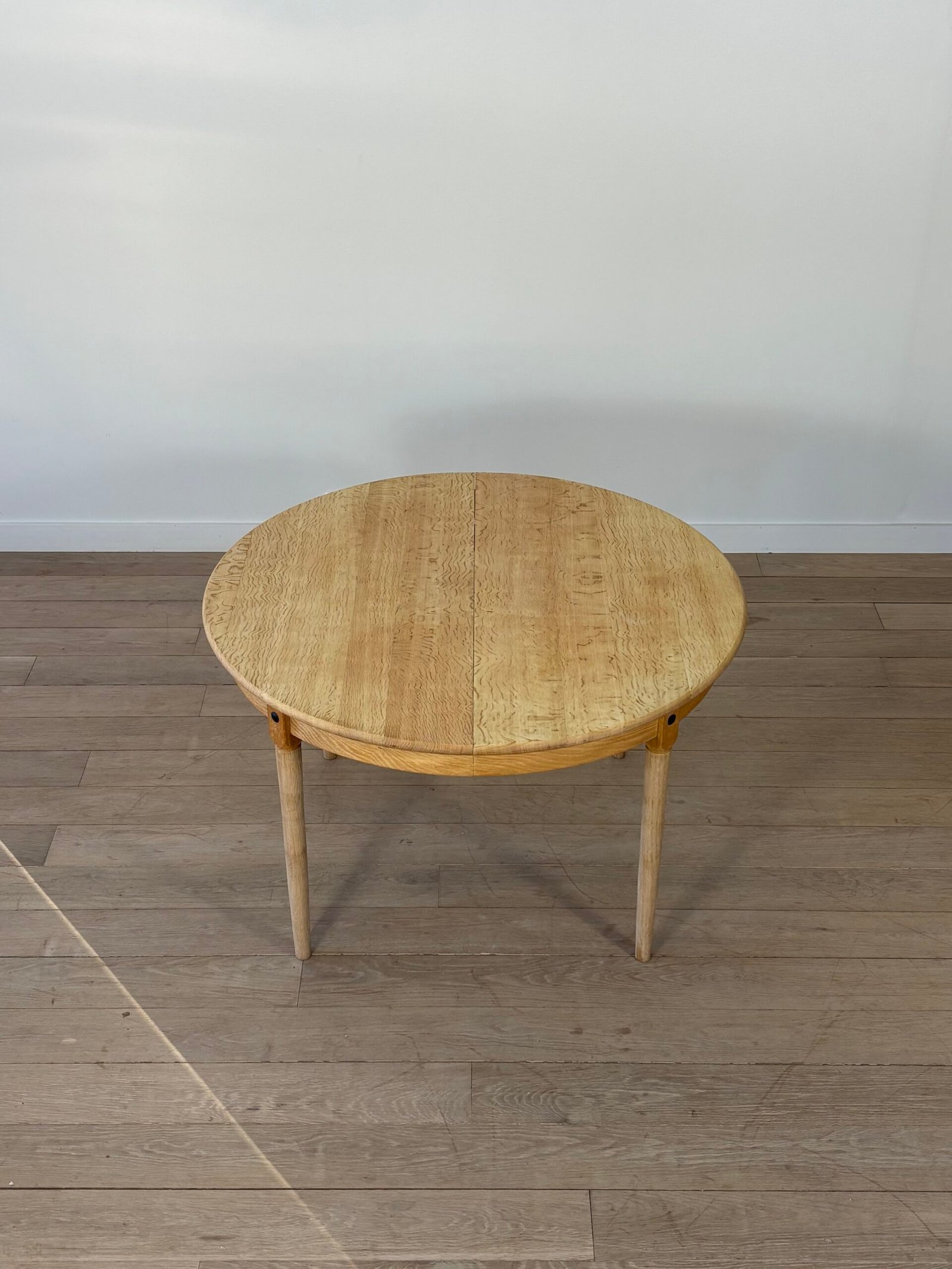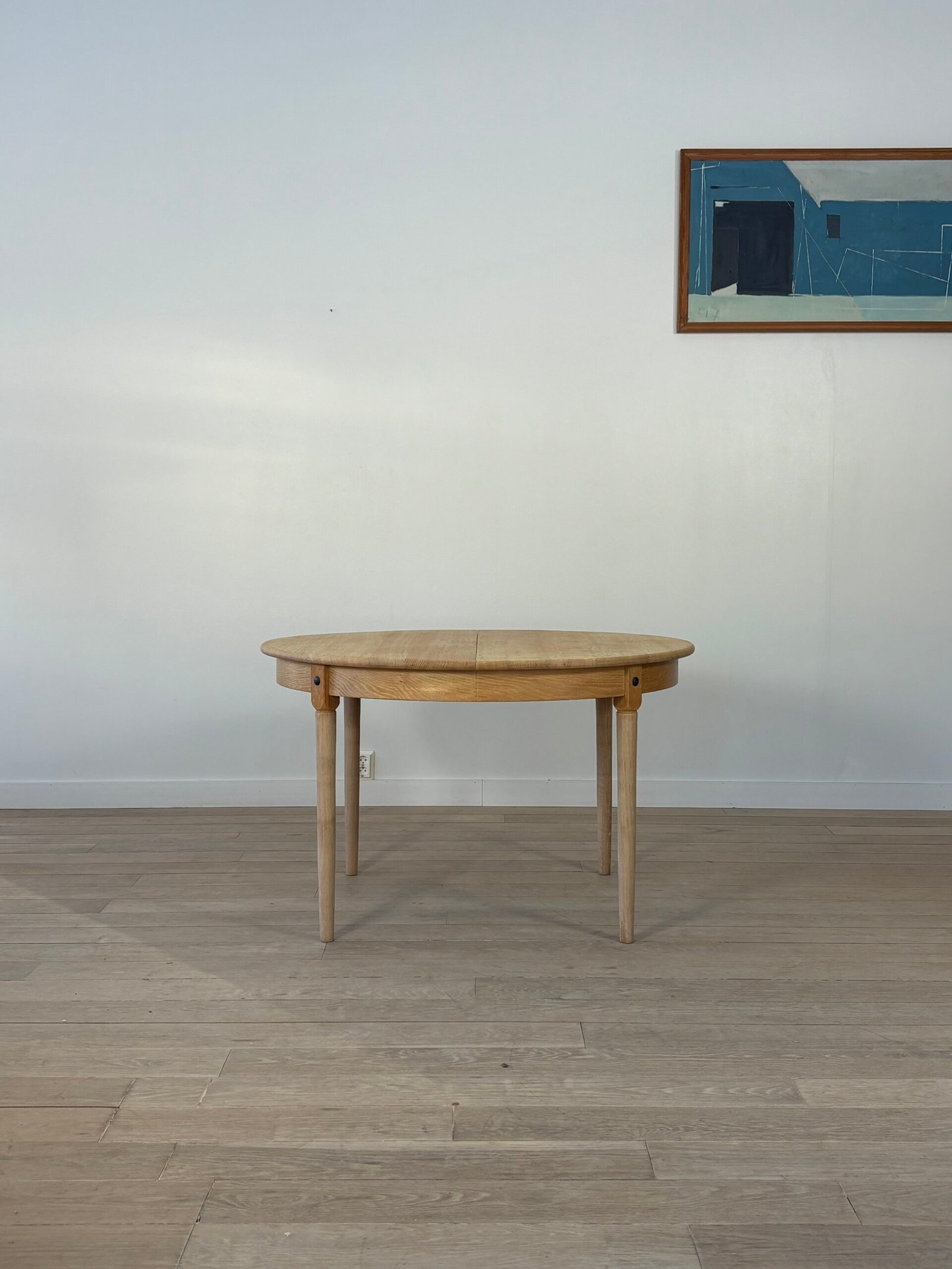 A stunning Danish massive light oak round extendable dining table from the 1950s–60s. When fully extended, the table comfortably seats 8–10 people. The table has been sanded and finished with natural wax, providing durable protection and a beautiful surface. Two extension leaves are included.