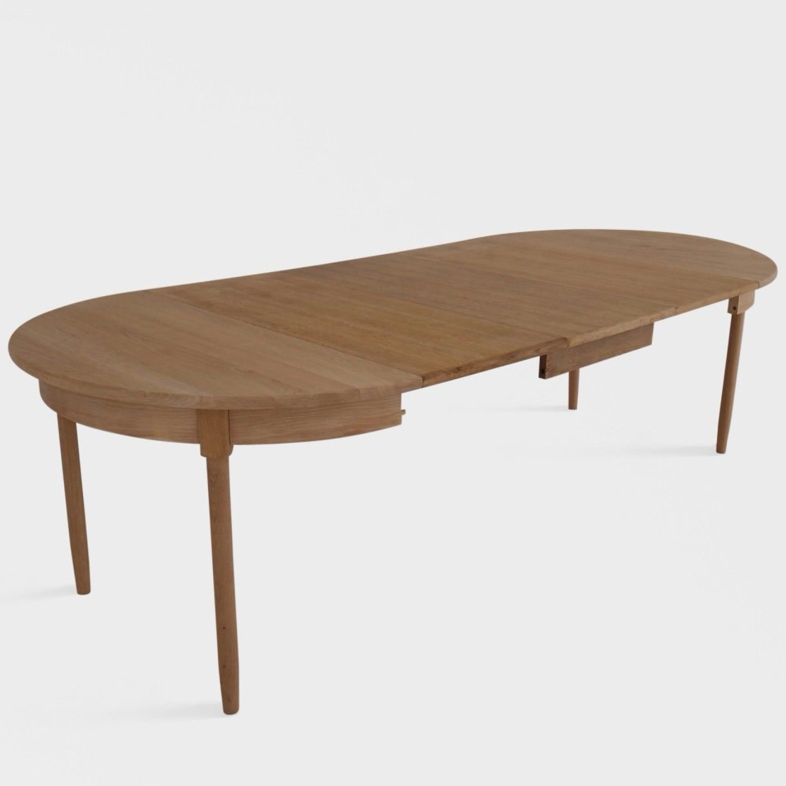 A round Danish solid oak extendable dining table from the 1960s, including two extension leaves. The table comfortably seats 6–8 people.