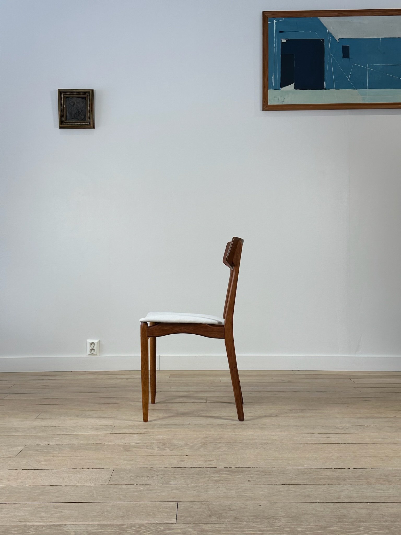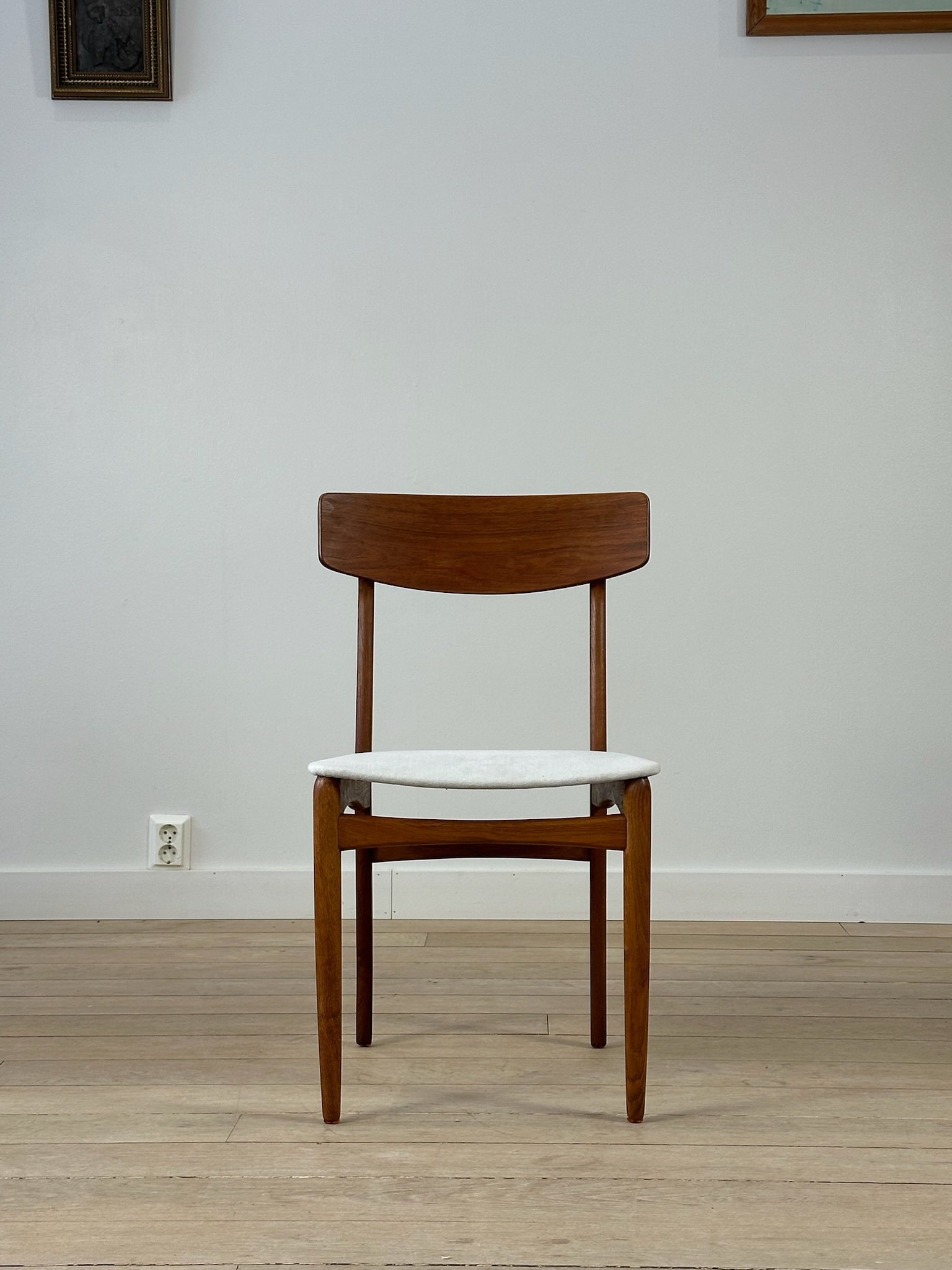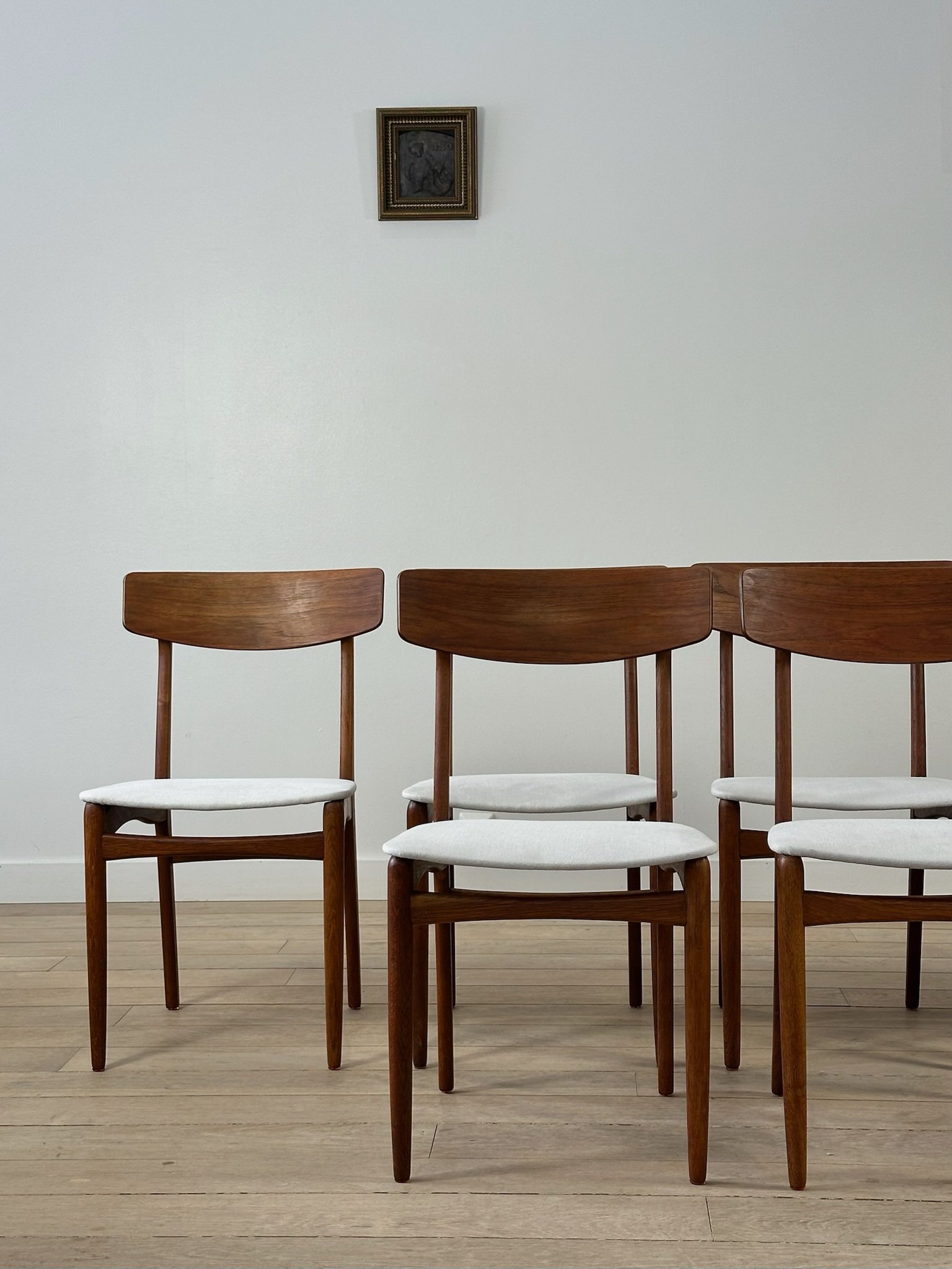 Beautiful Danish teak dining chairs from the 1960s in the style of Farstrup Møbelfabrik. The chairs have been restored, and the seats have been reupholstered in a lovely natural light-colored fabric.