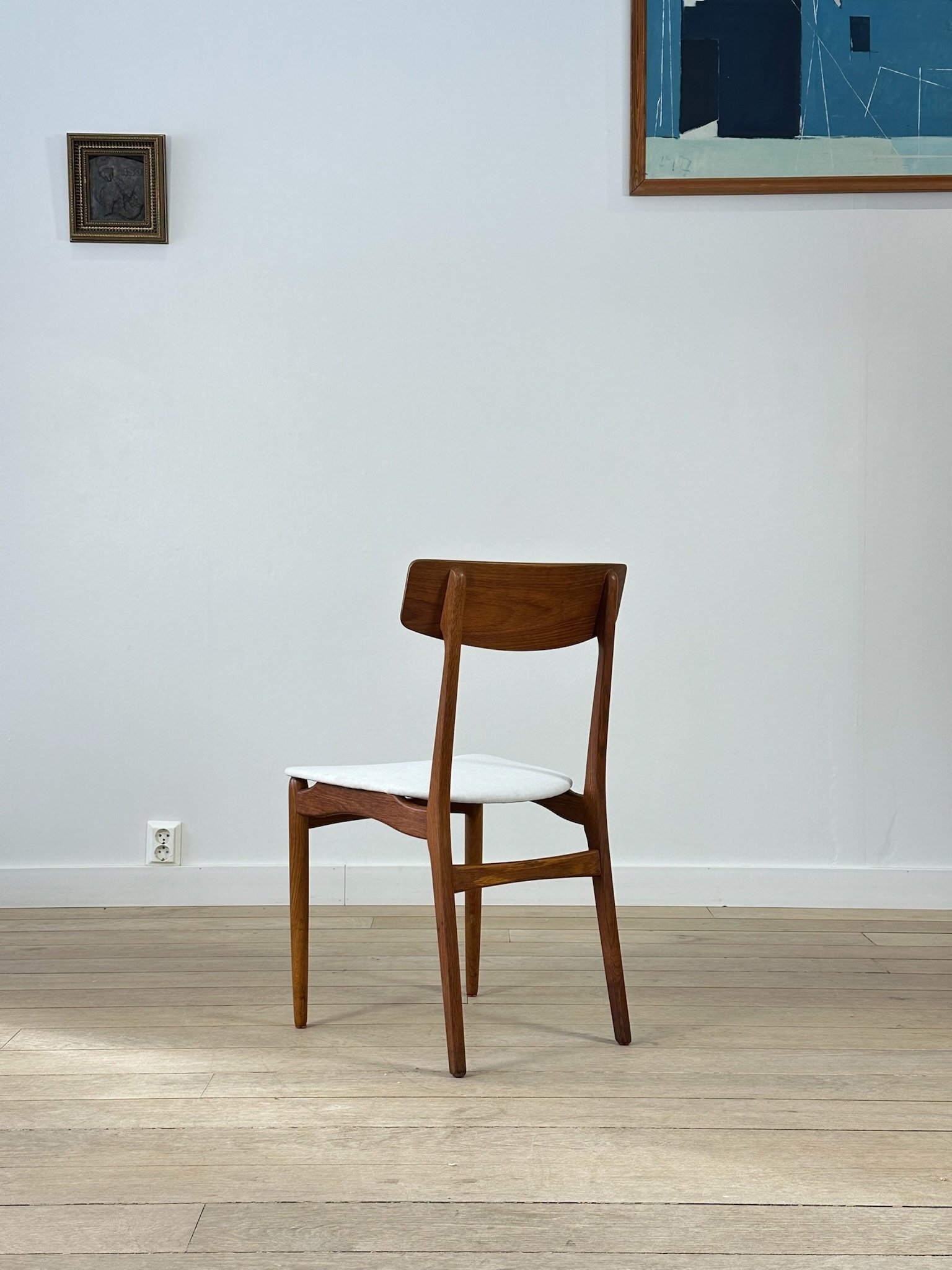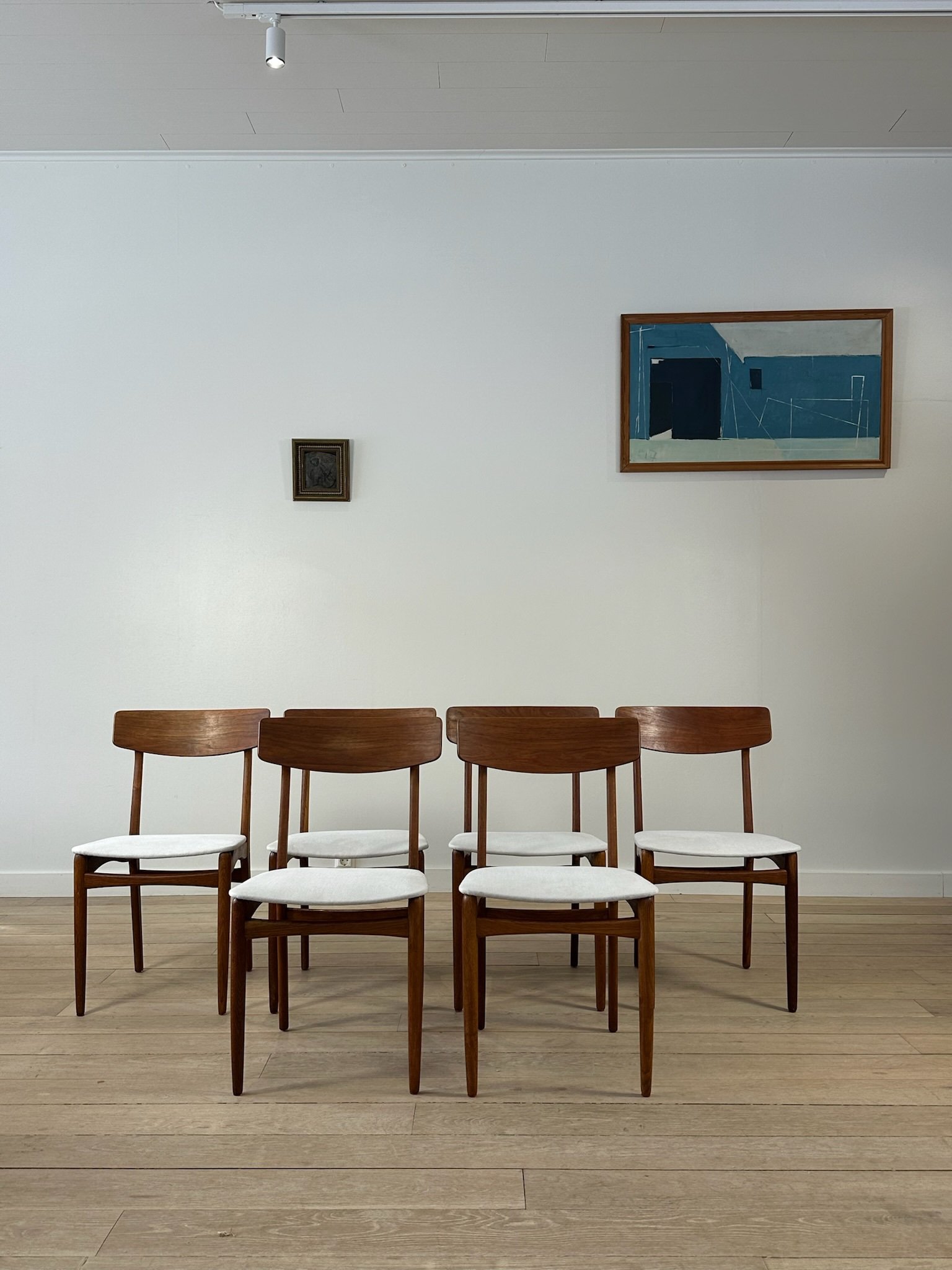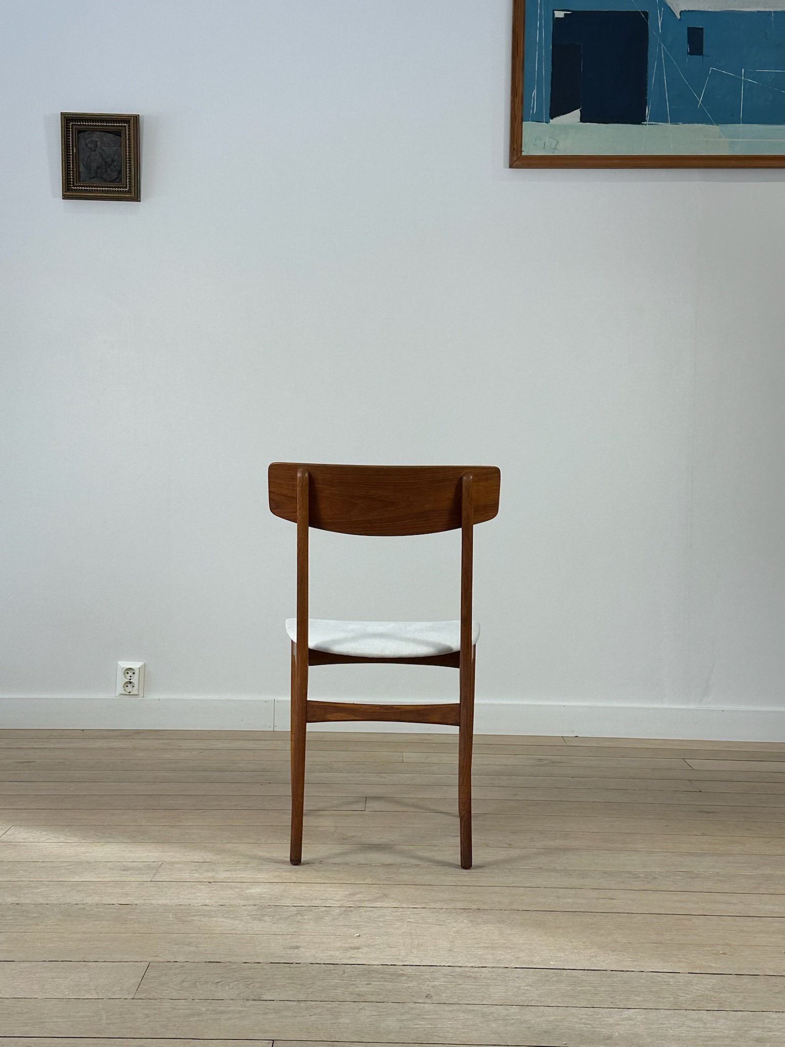 Beautiful Danish teak dining chairs from the 1960s in the style of Farstrup Møbelfabrik. The chairs have been restored, and the seats have been reupholstered in a lovely natural light-colored fabric.