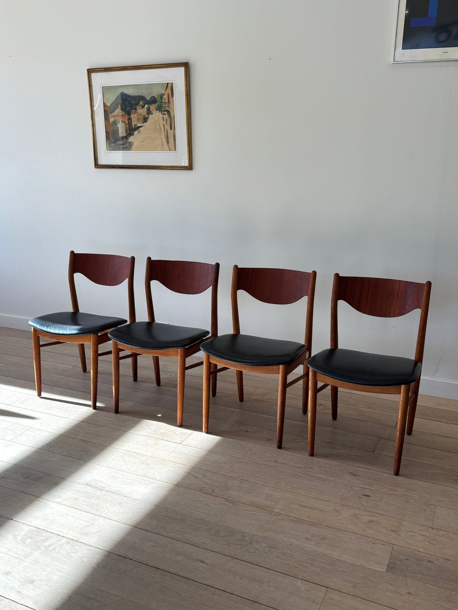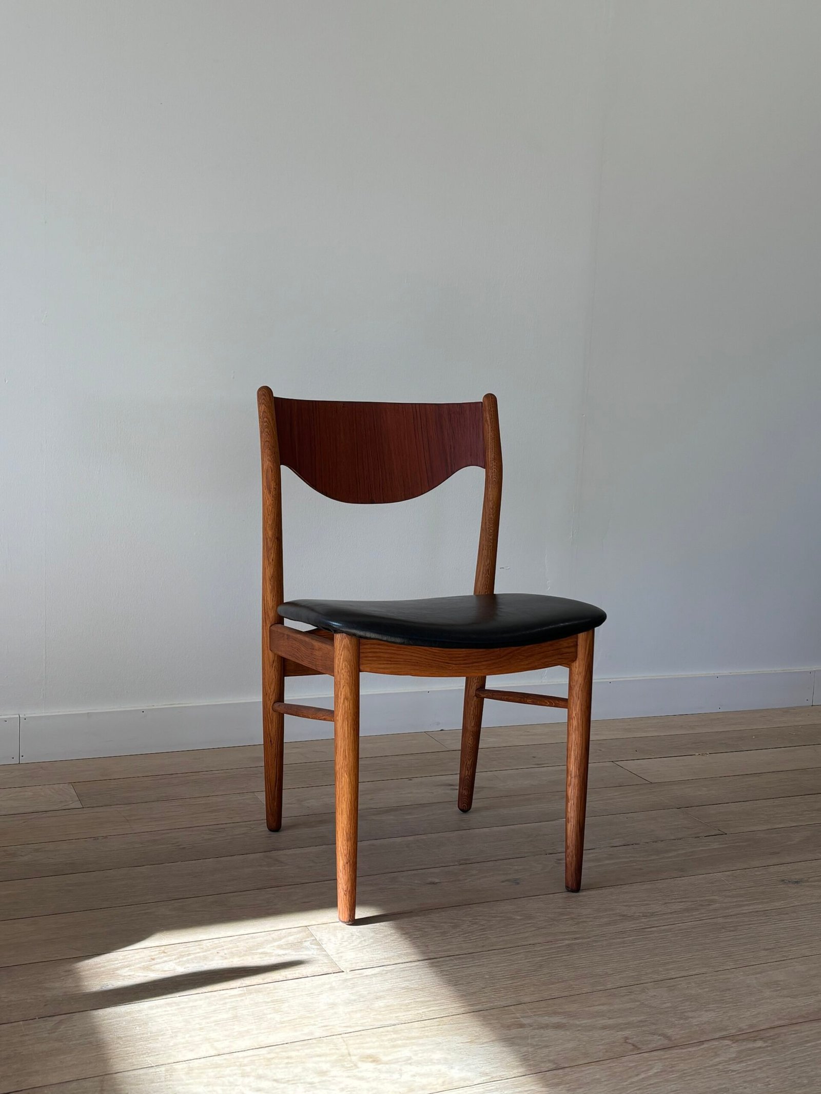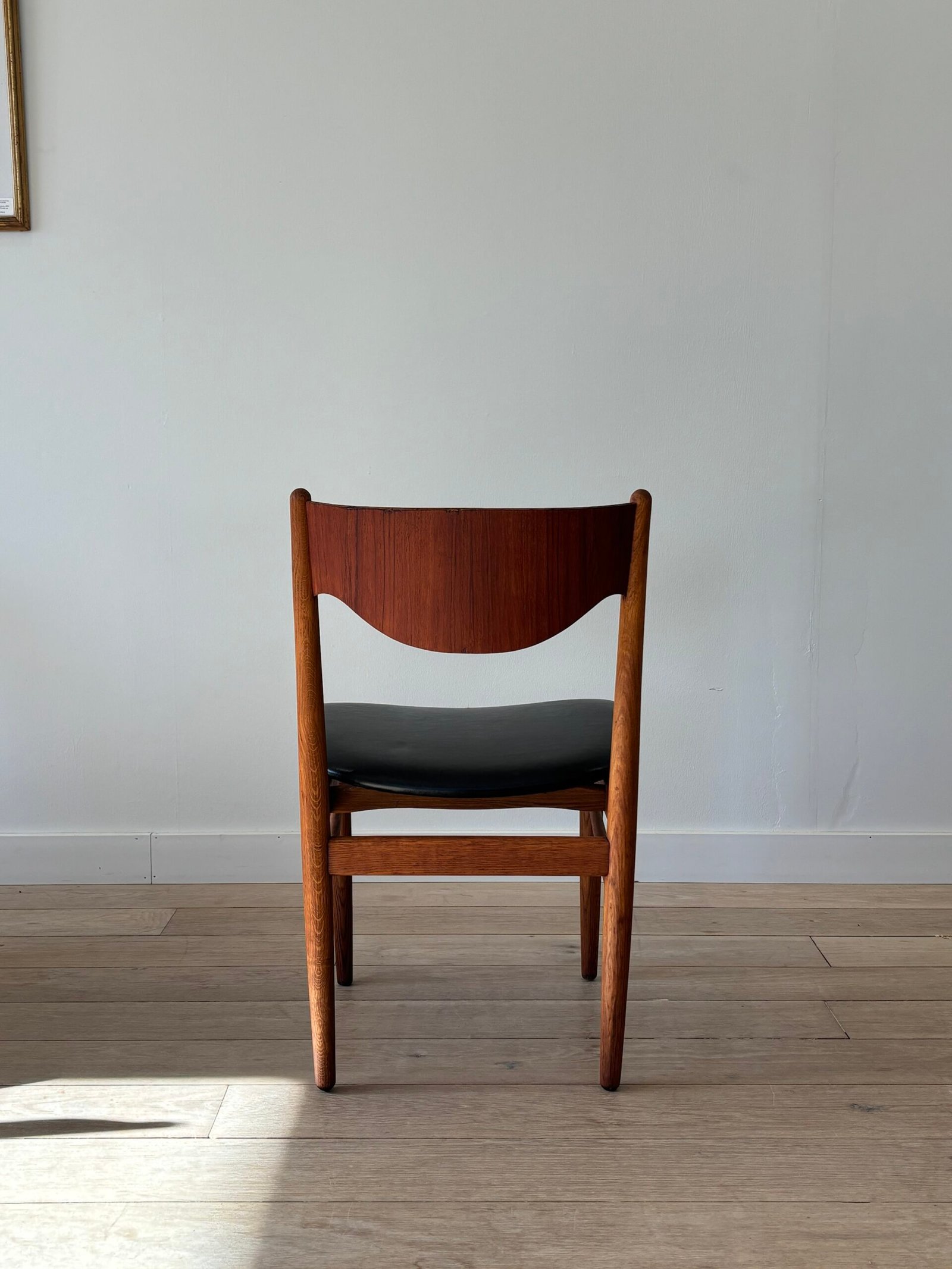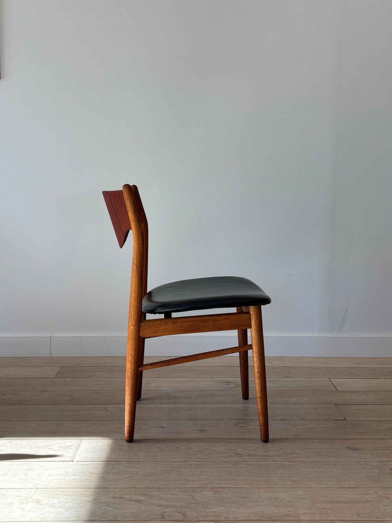 Oak and teak dining chairs from the 1960s, designed by Danish designer Helge Sibast. The frame is made of oak and the backrest of teak. The seats have been reupholstered in genuine black leather. Available: 4 pcs. Price for all.