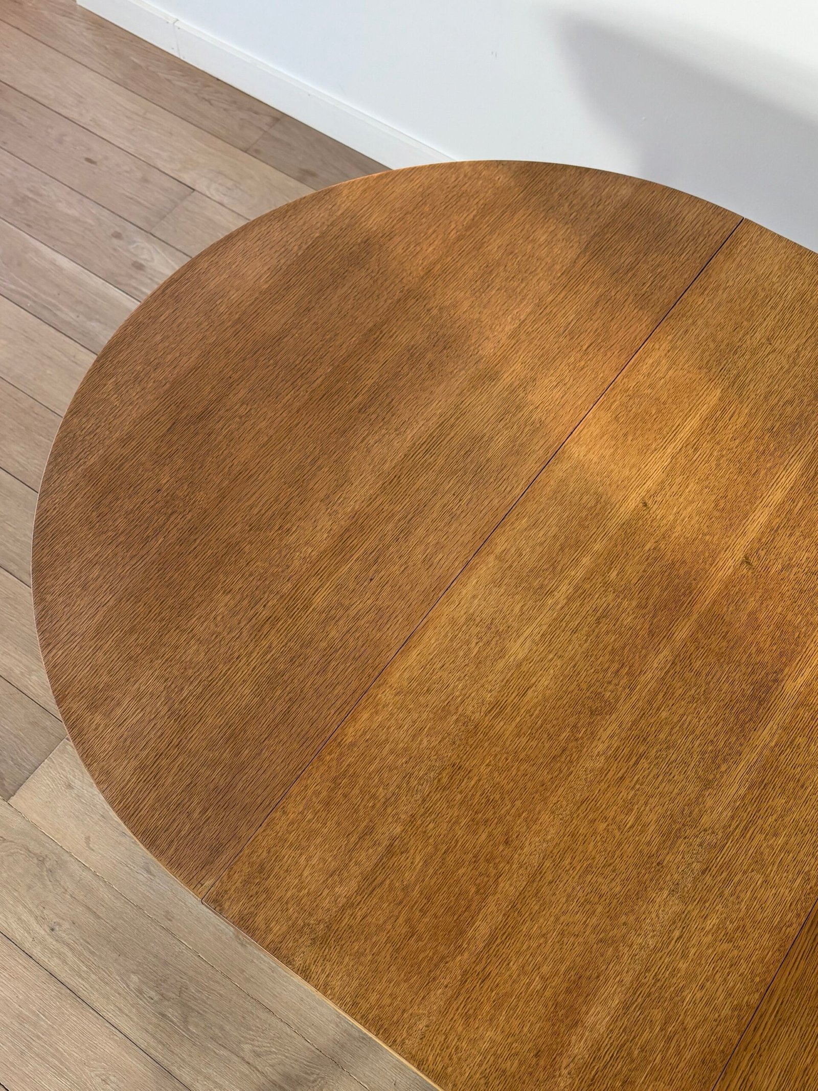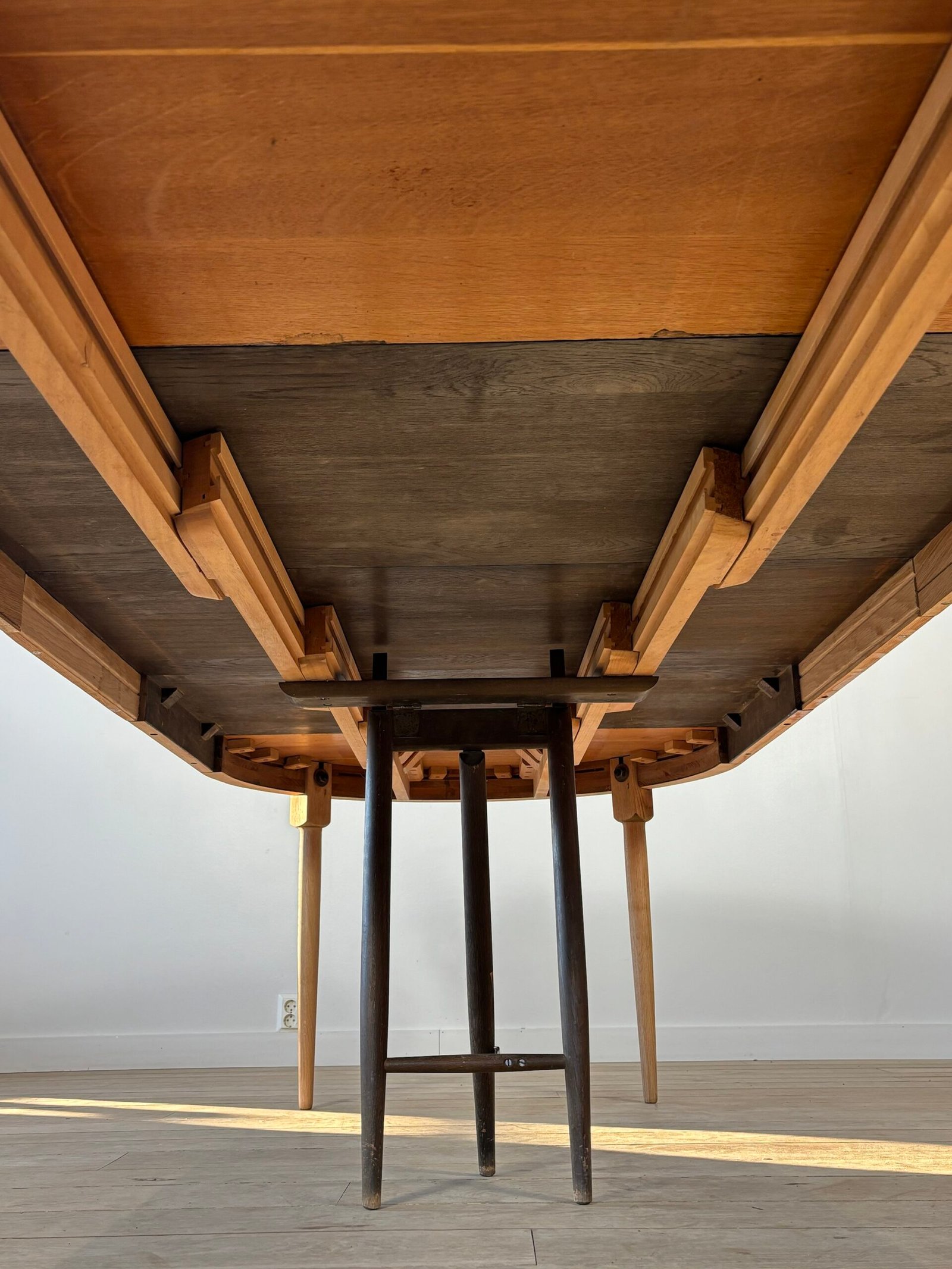 The table has been sanded and finished with natural wax. It is made from high-quality oak veneer and can be sanded many more times in the future. The table also features a support leg mechanism, providing extra stability when fully extended.