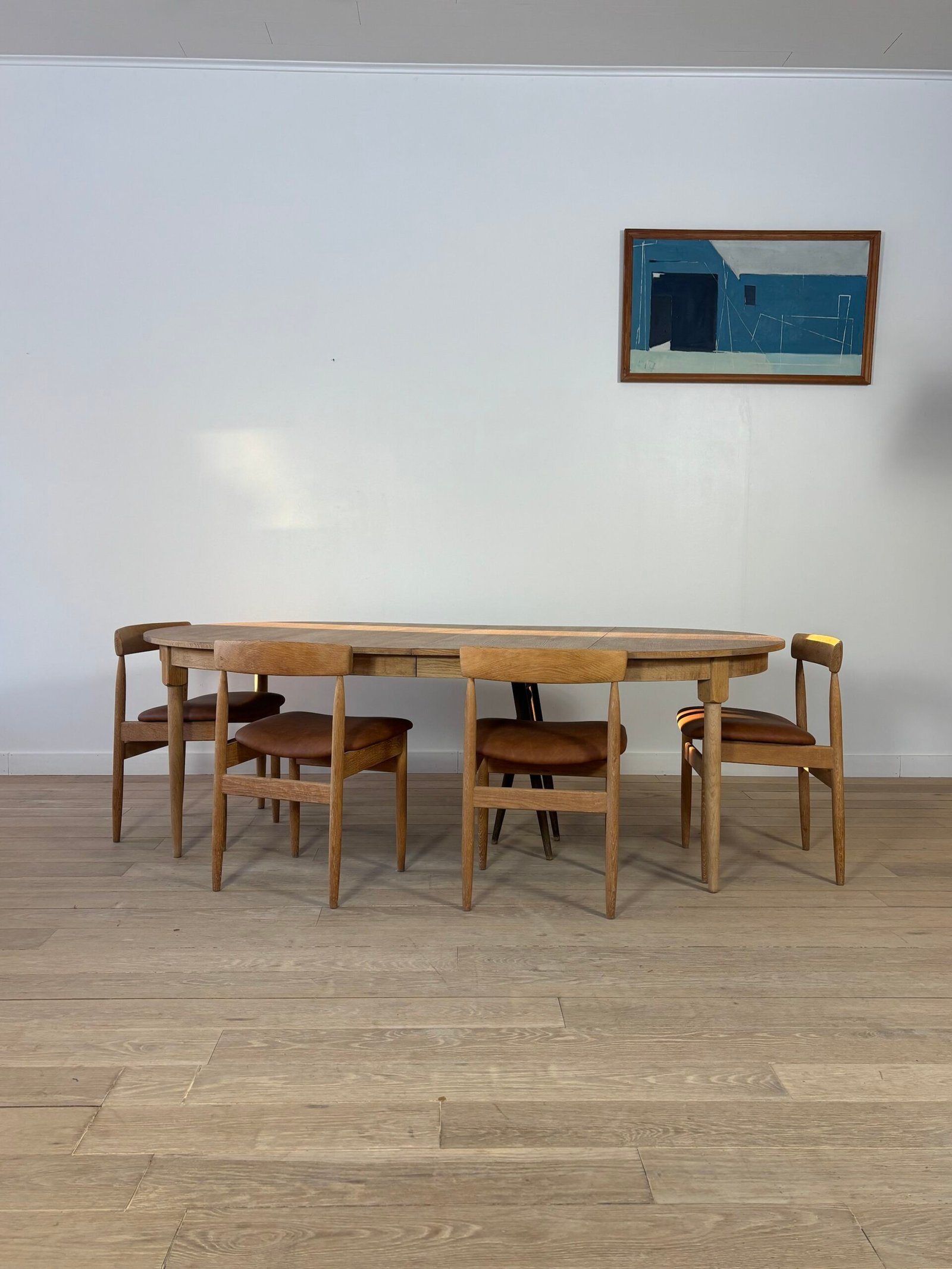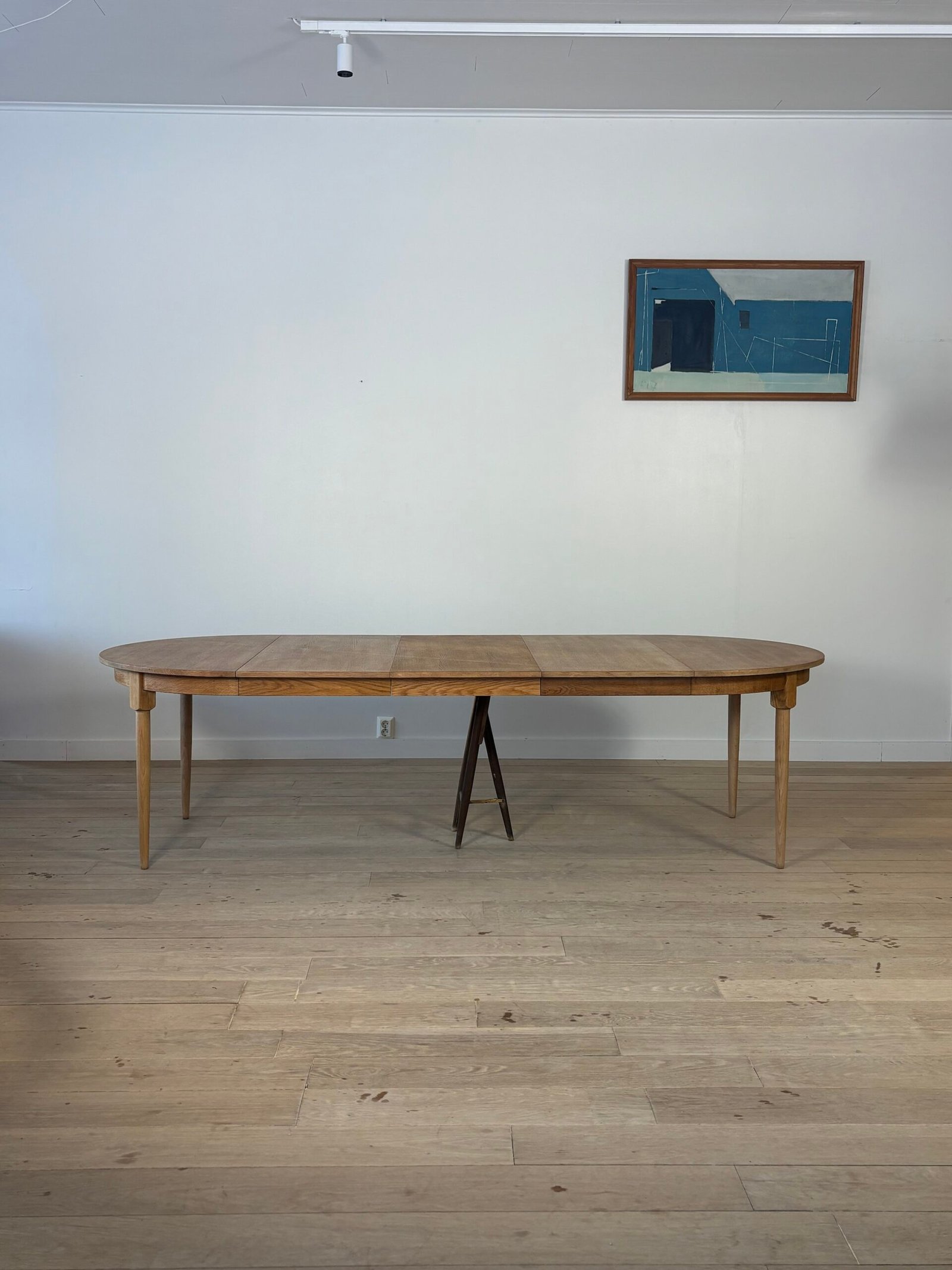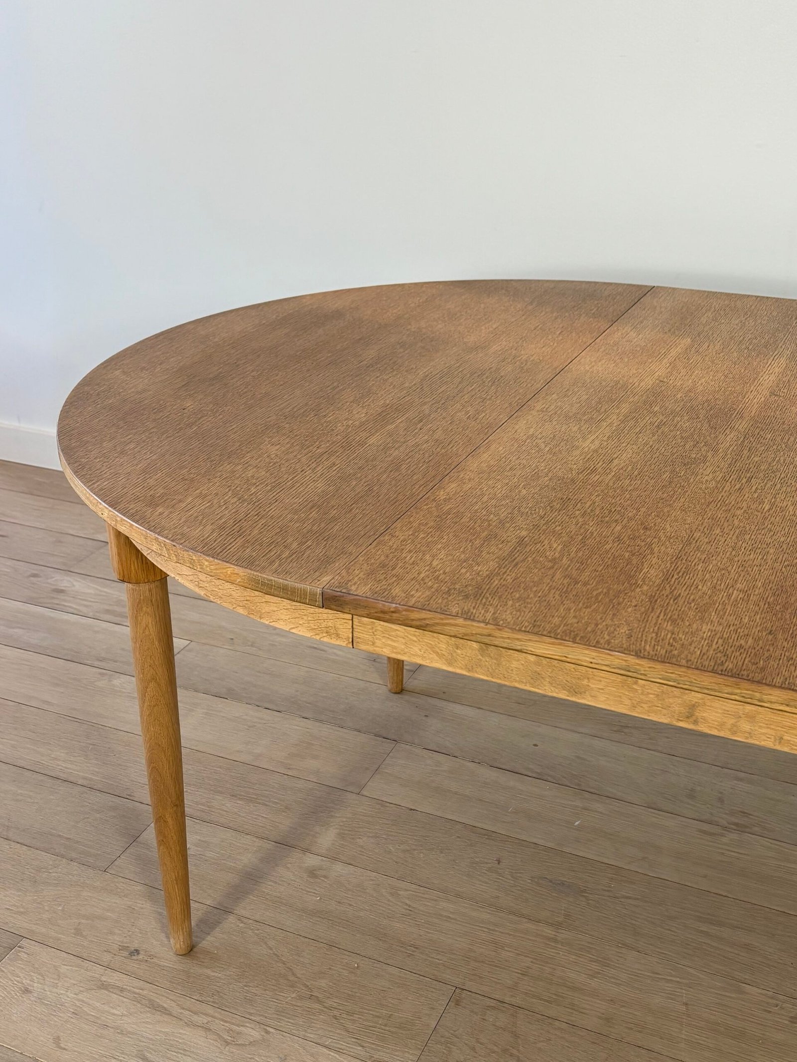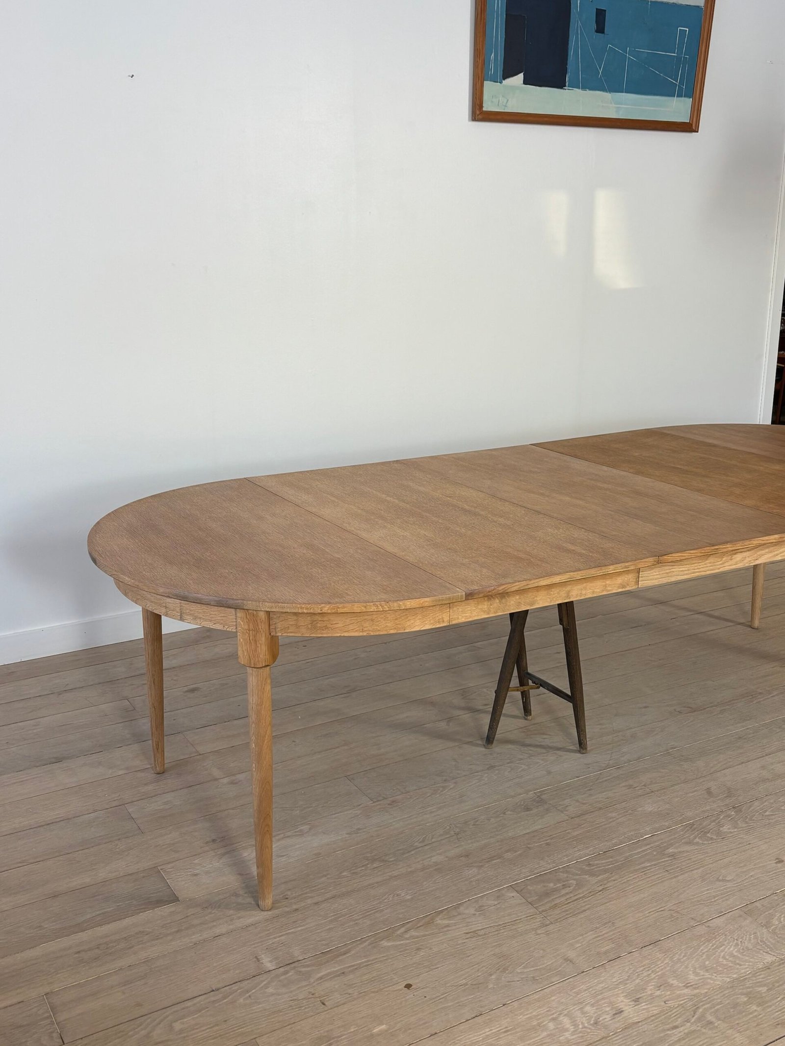 A Danish round extendable oak dining table from the 1950s–60s, designed by Henning Kjærnulf and produced by Sorø Stolefabrik. When fully extended, the table comfortably seats 10–12 people. Three extension leaves are included and can be used individually as needed.