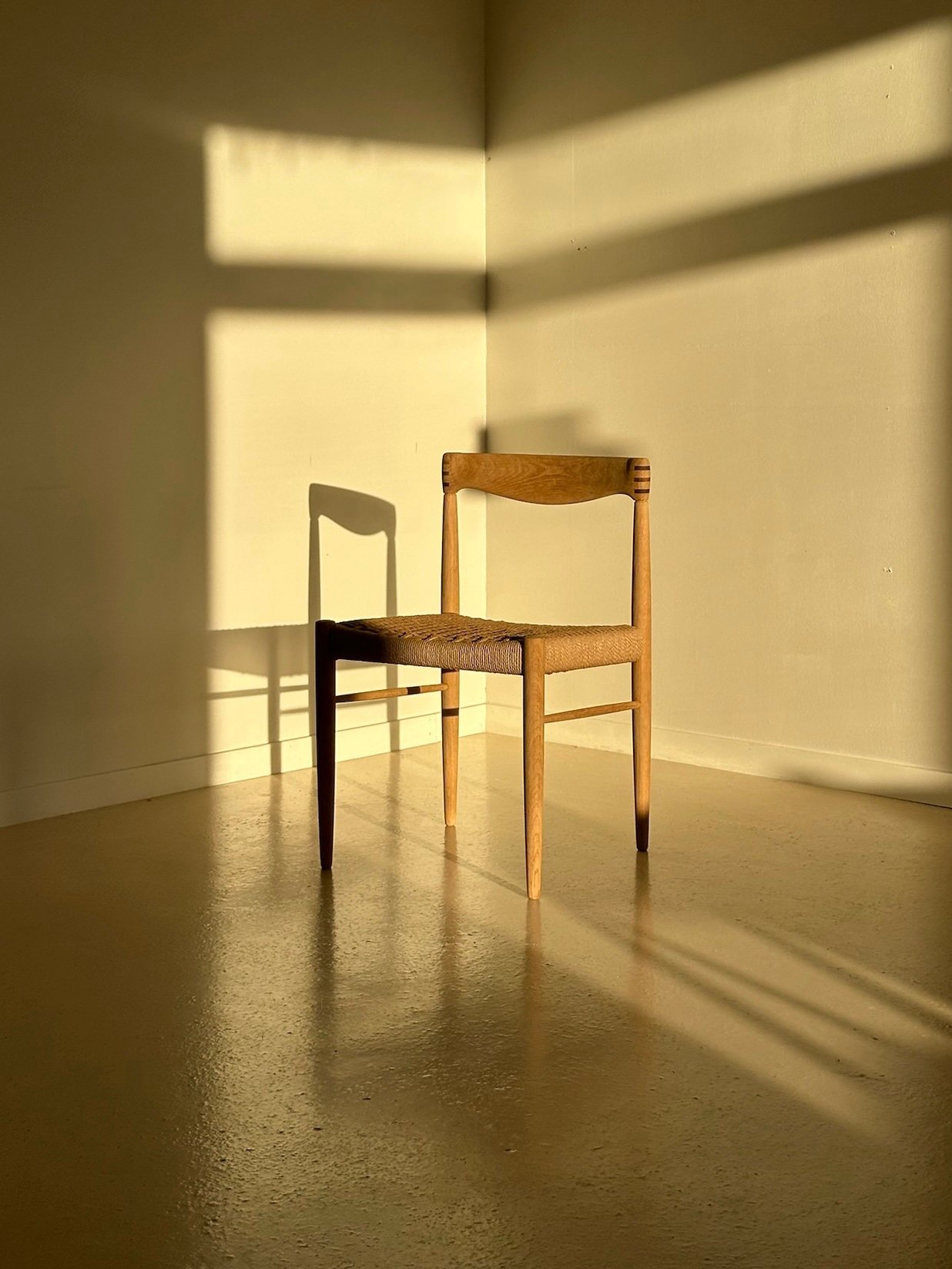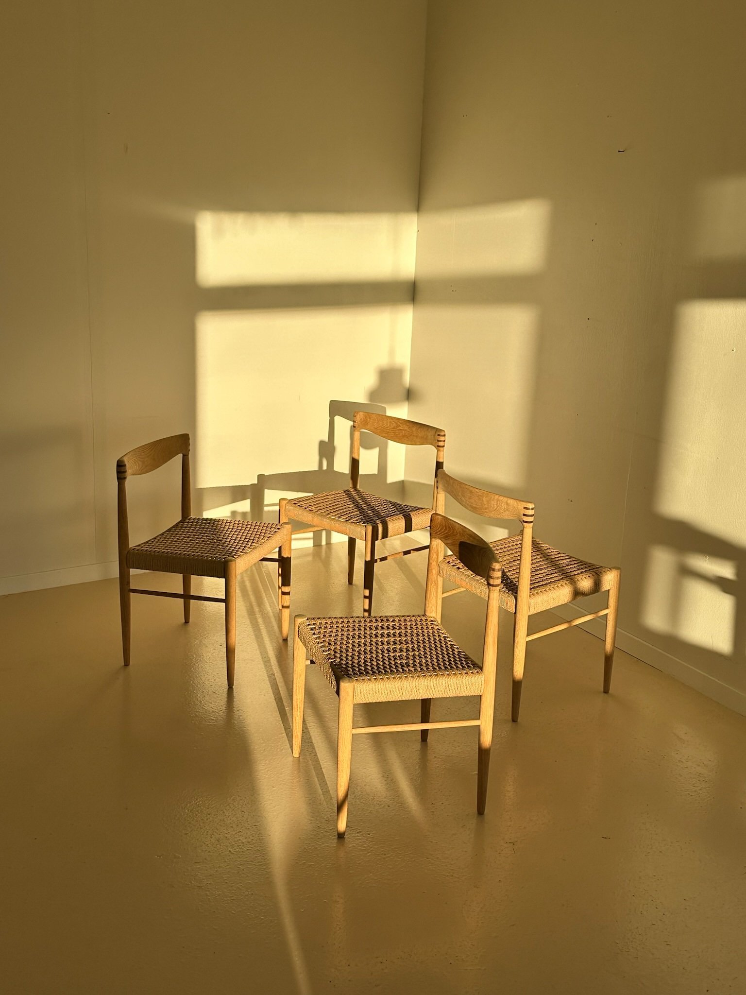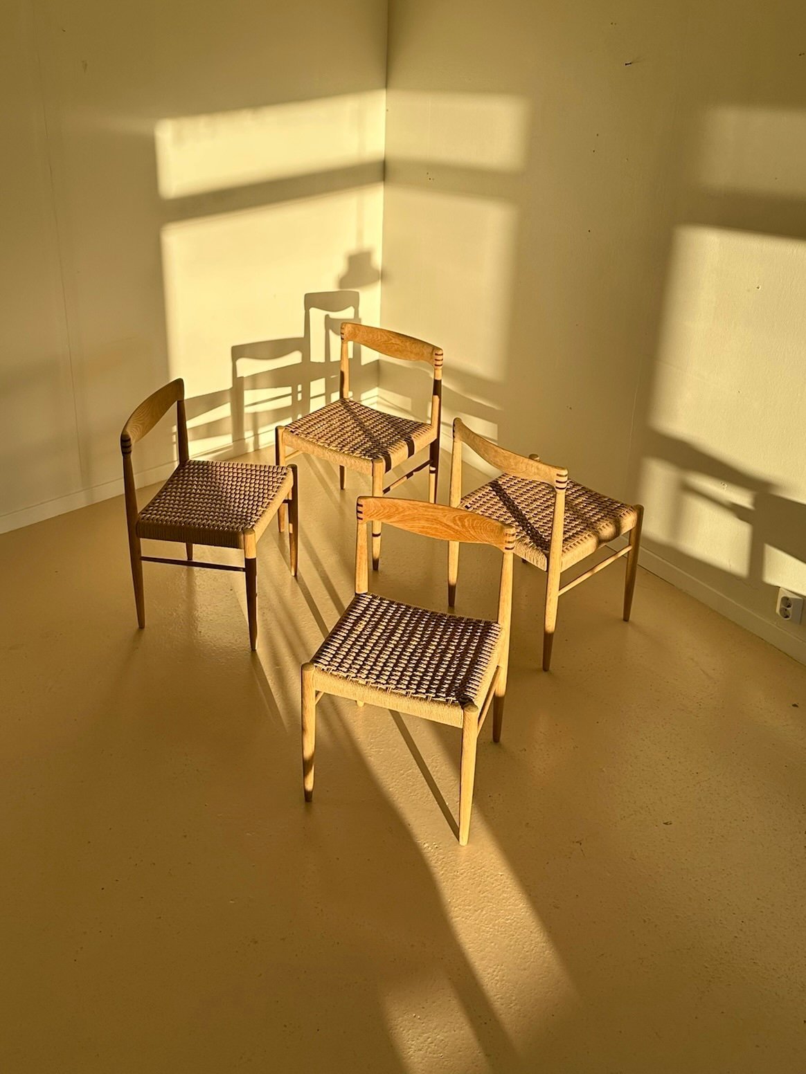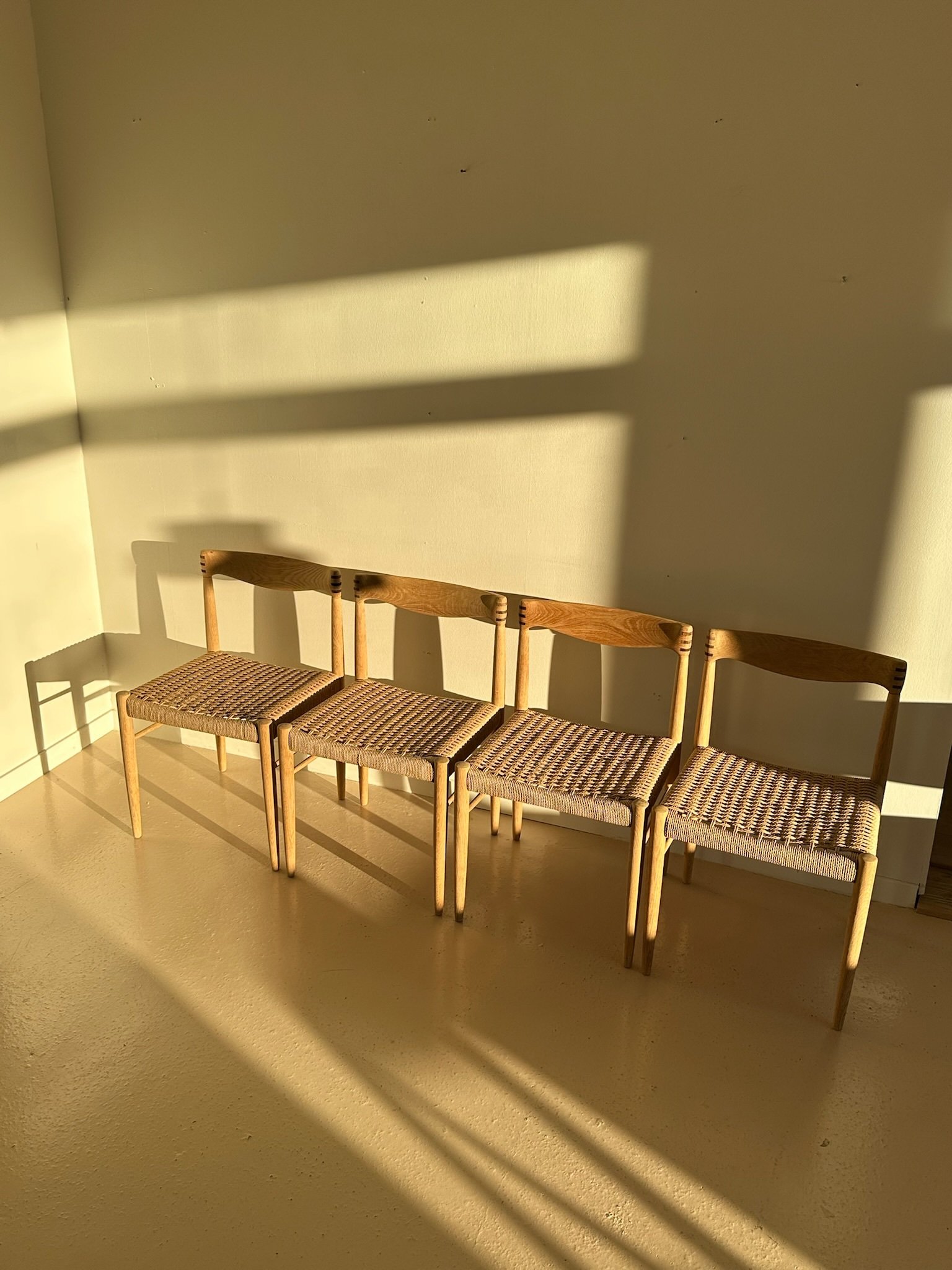Beautiful and high-quality dining chairs made from soap-treated oak, featuring new Danish paper cord weaving.