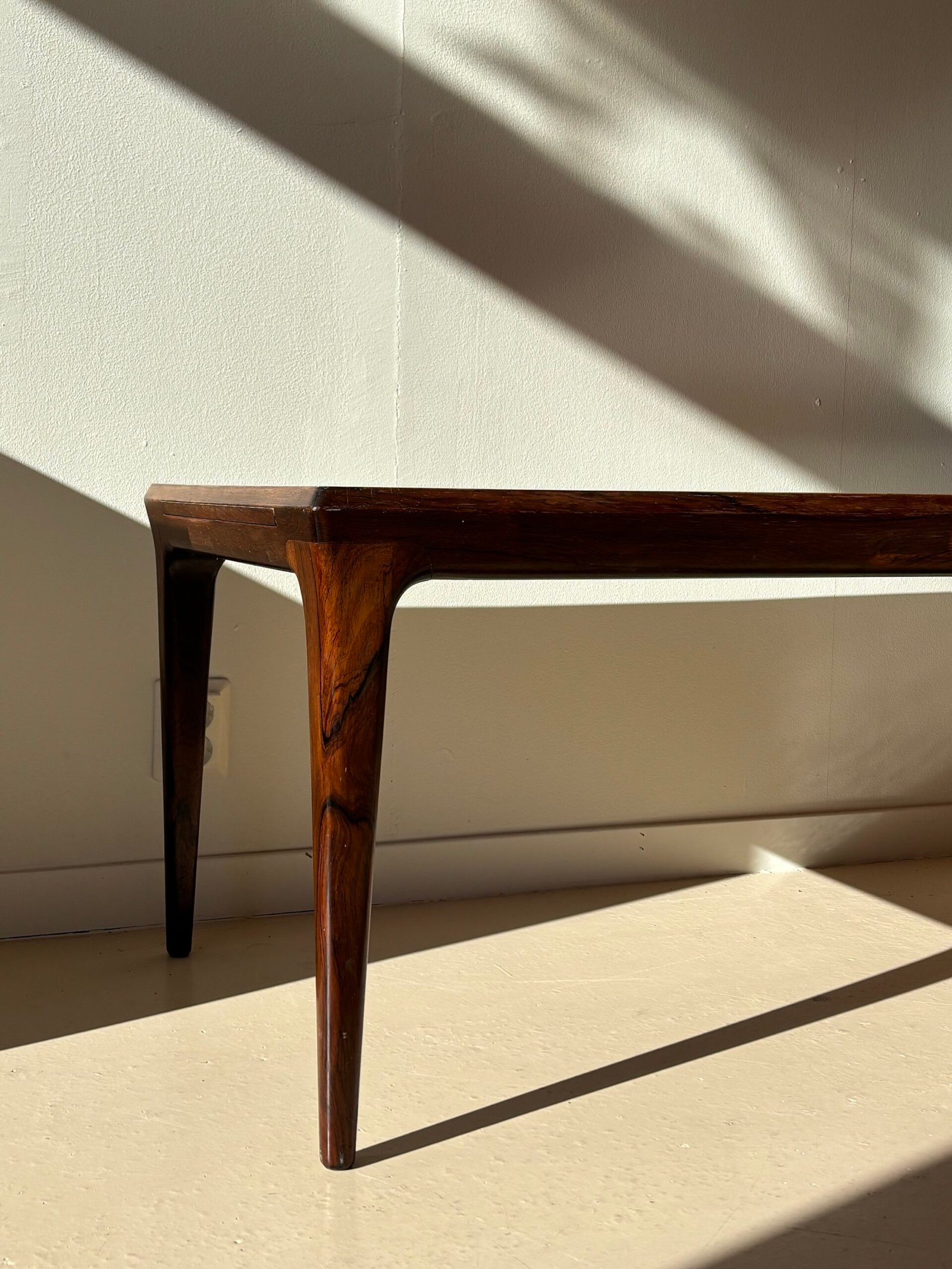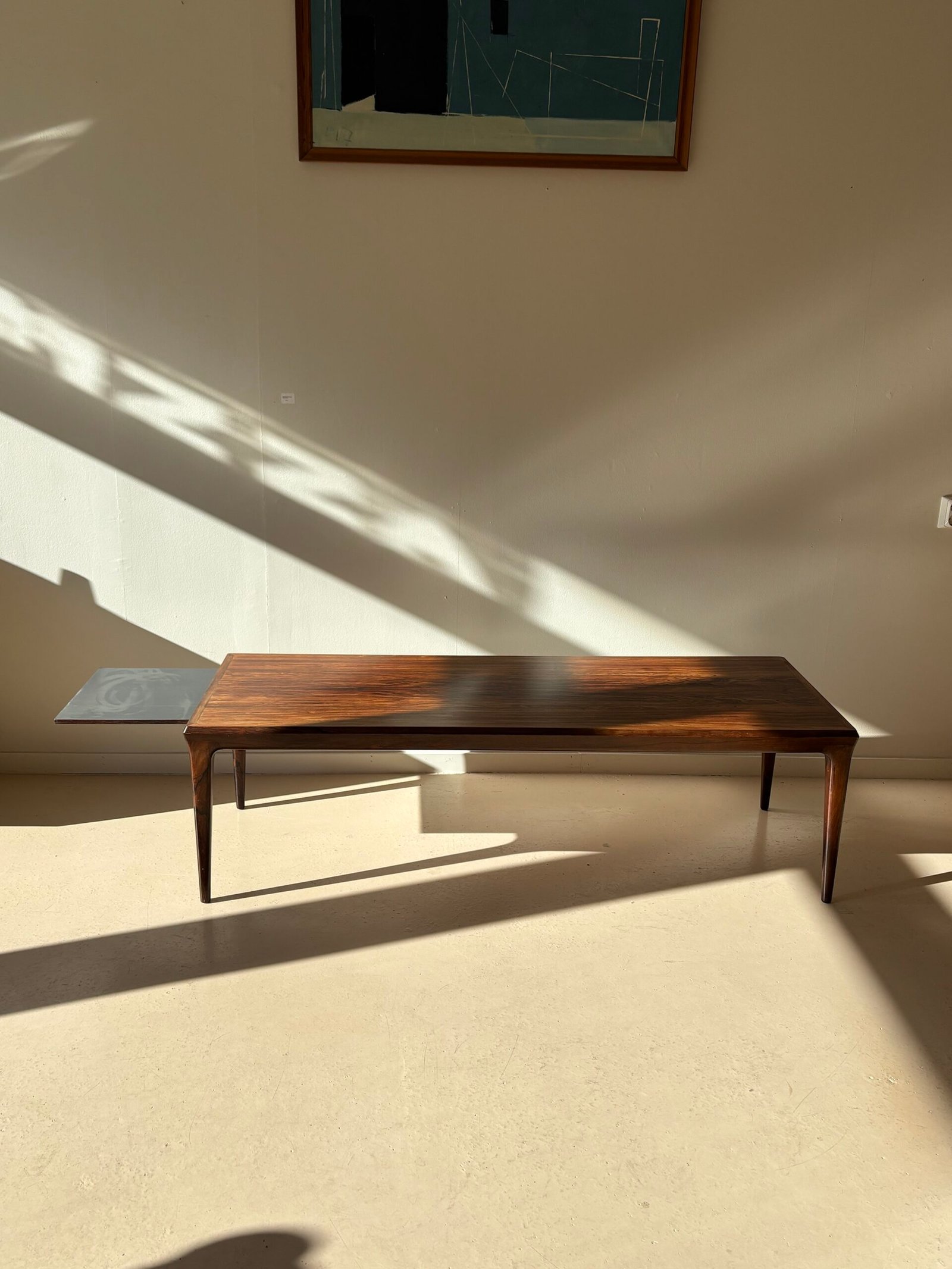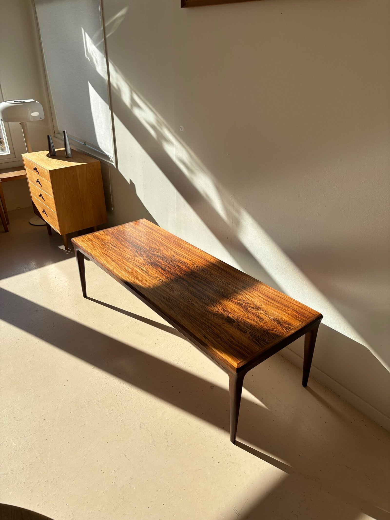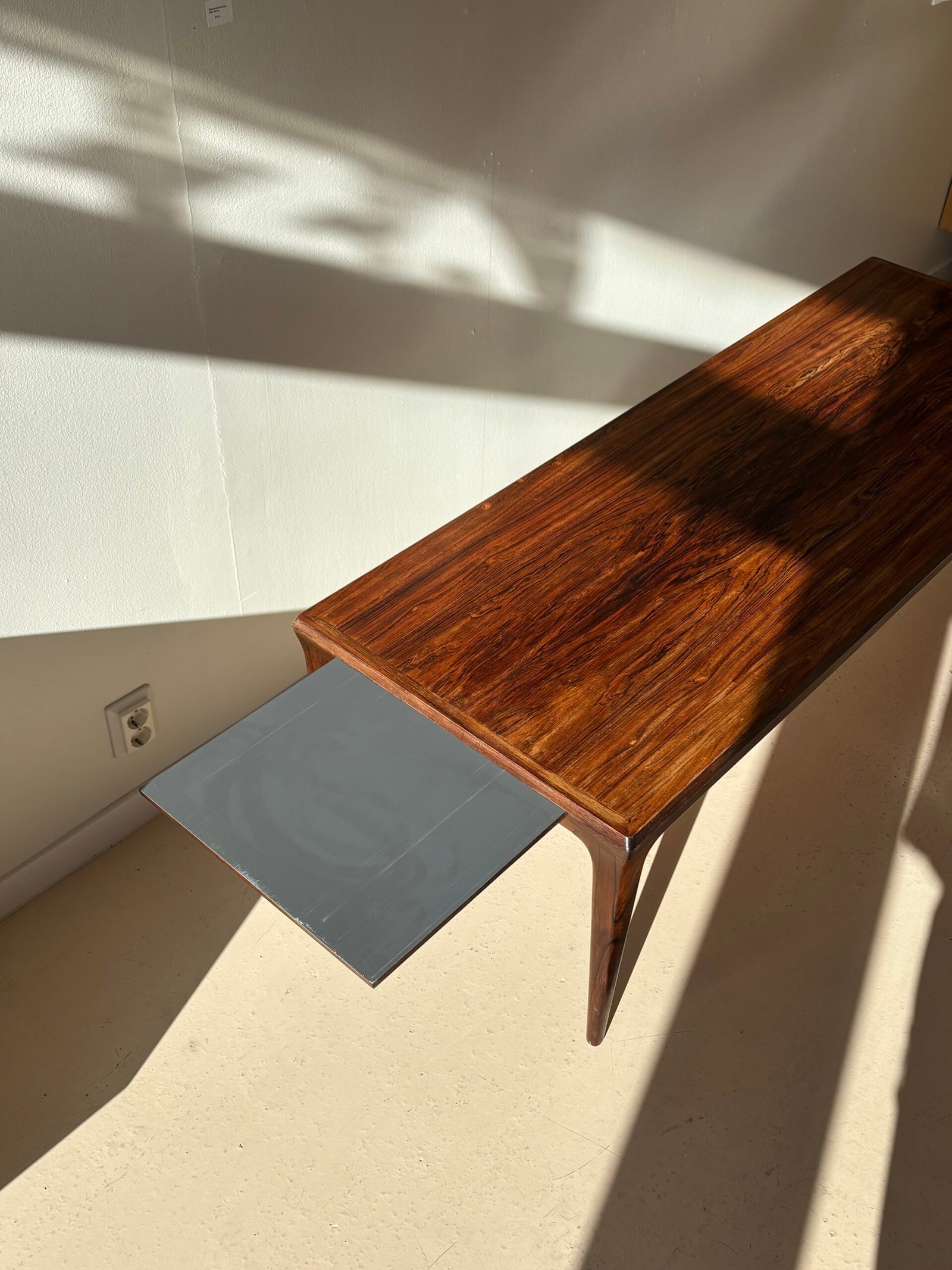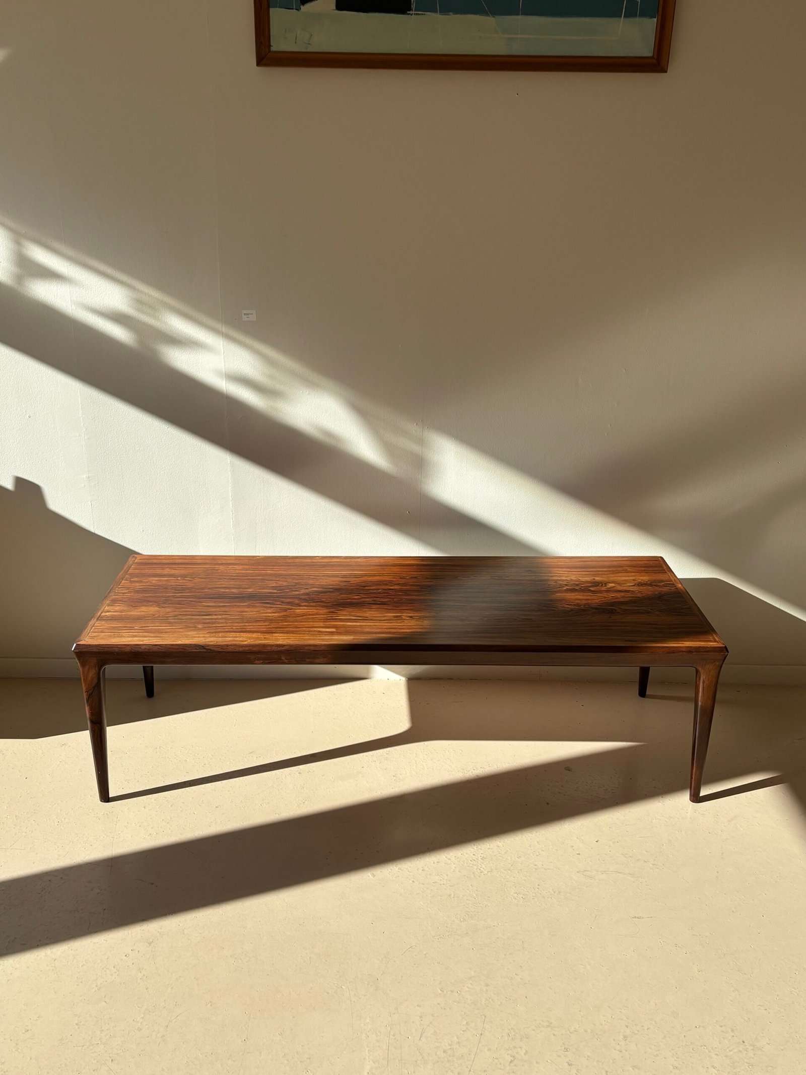 Johannes Andersenin suunnittelema ja Silkeborg Møbelfabrikin tuottama pitkä ja matala ruusupuinen huikea sohvapöytä. Pöydässä on myös jatkettava ulosvedettävä pala. Pöytä on täysin kunnostettu ja lakattu.