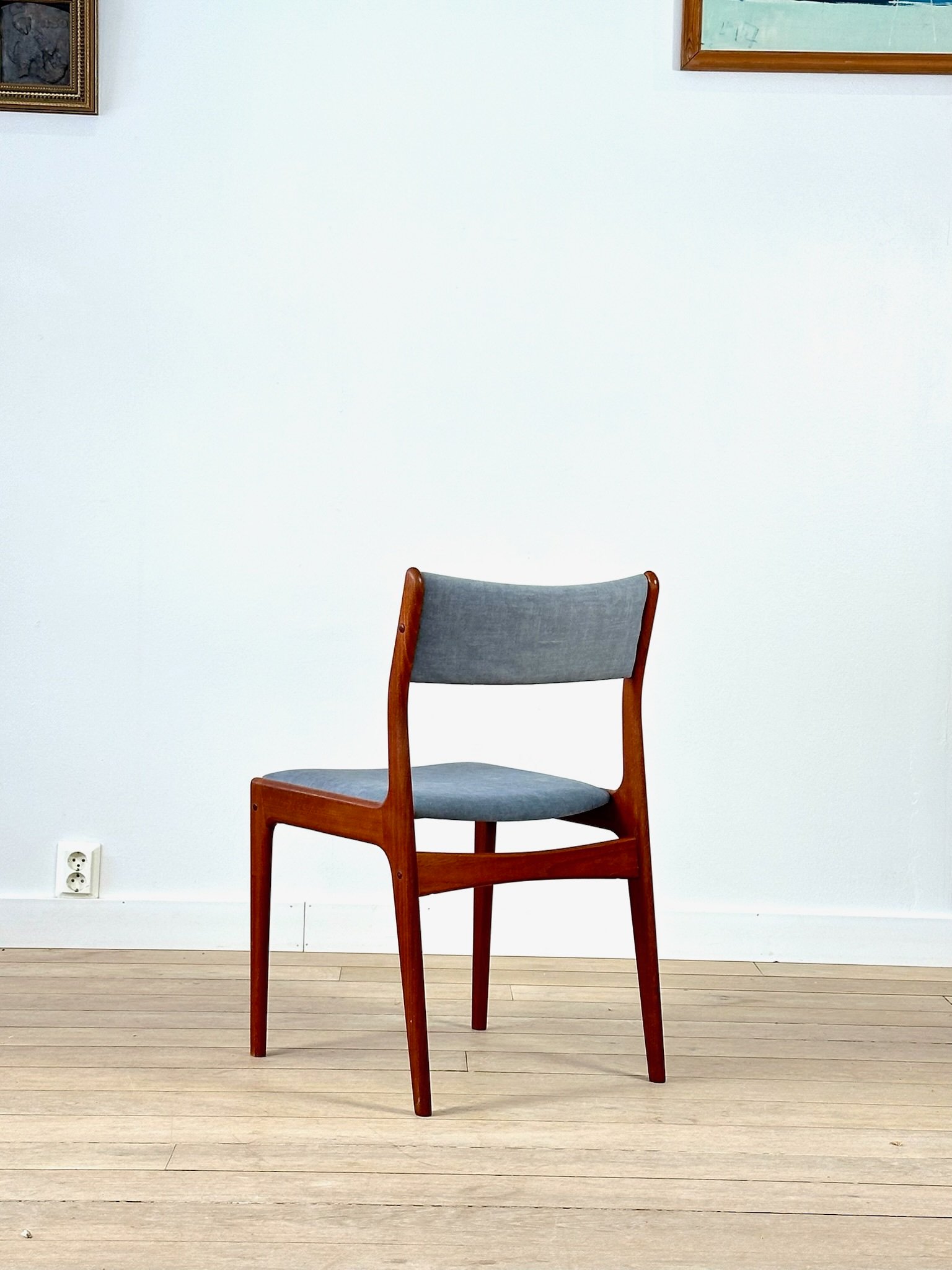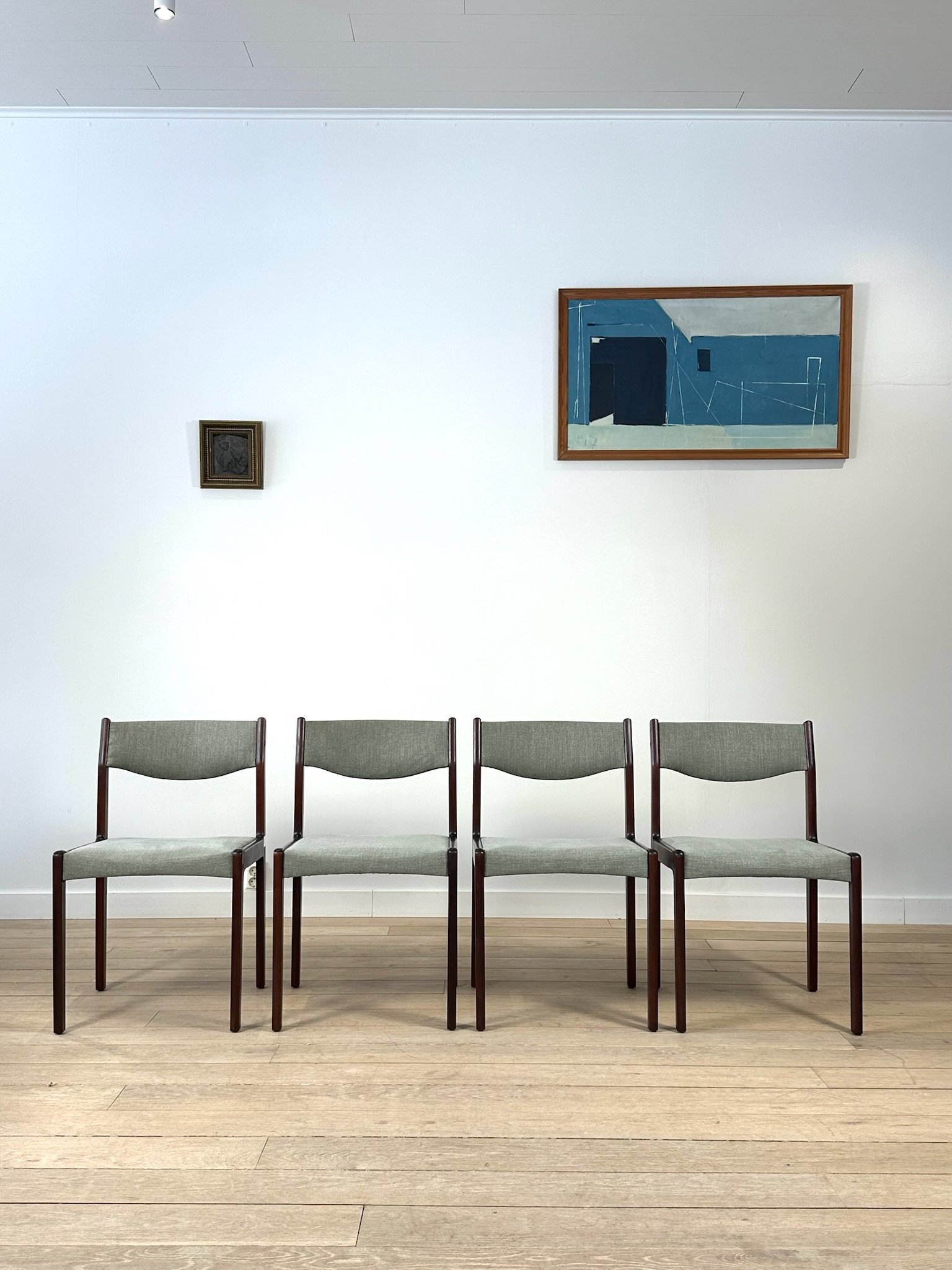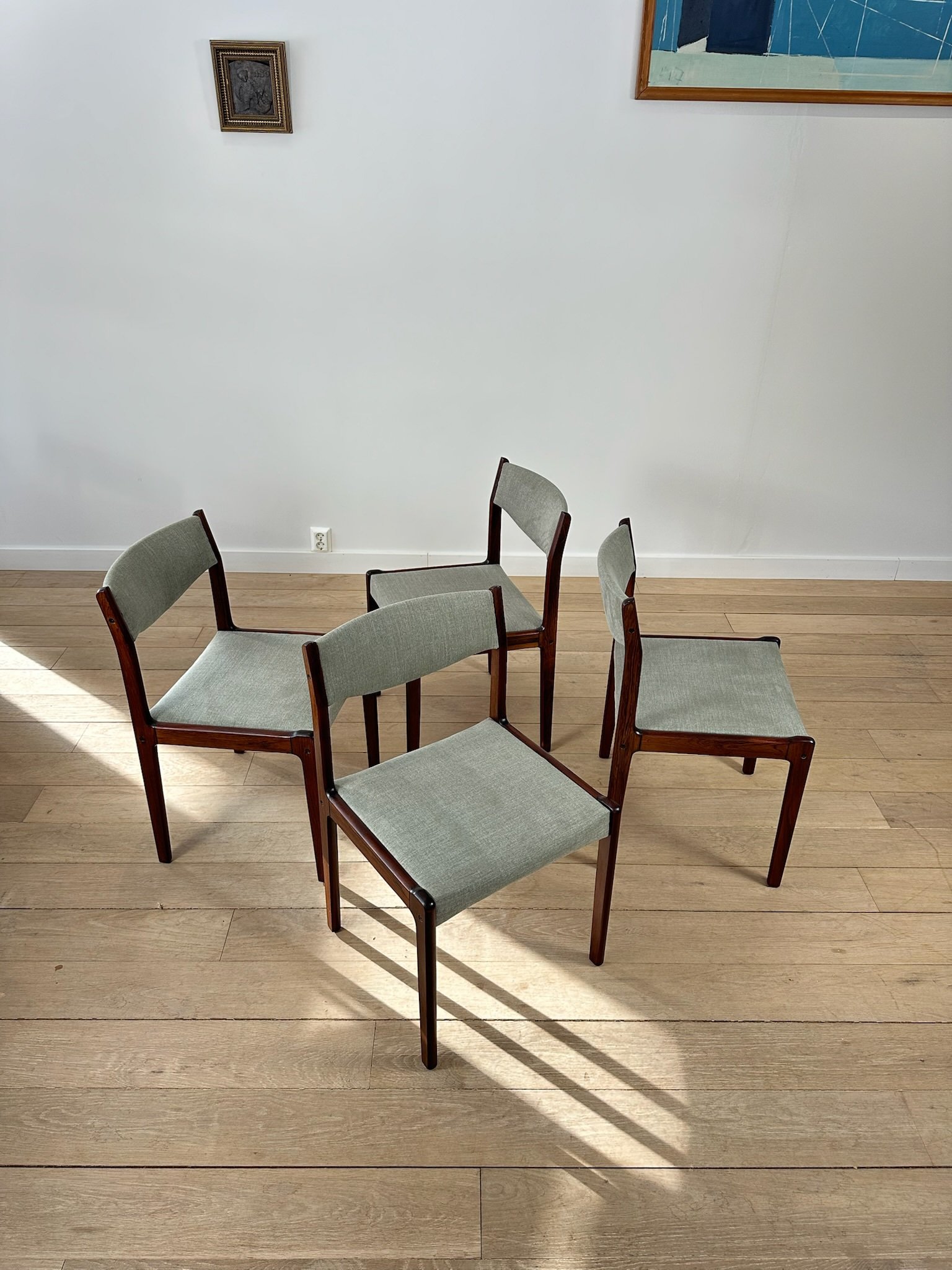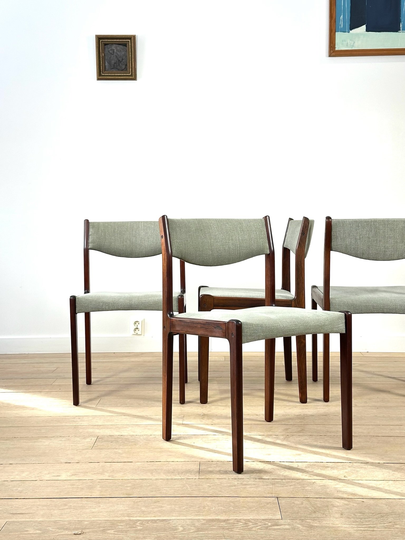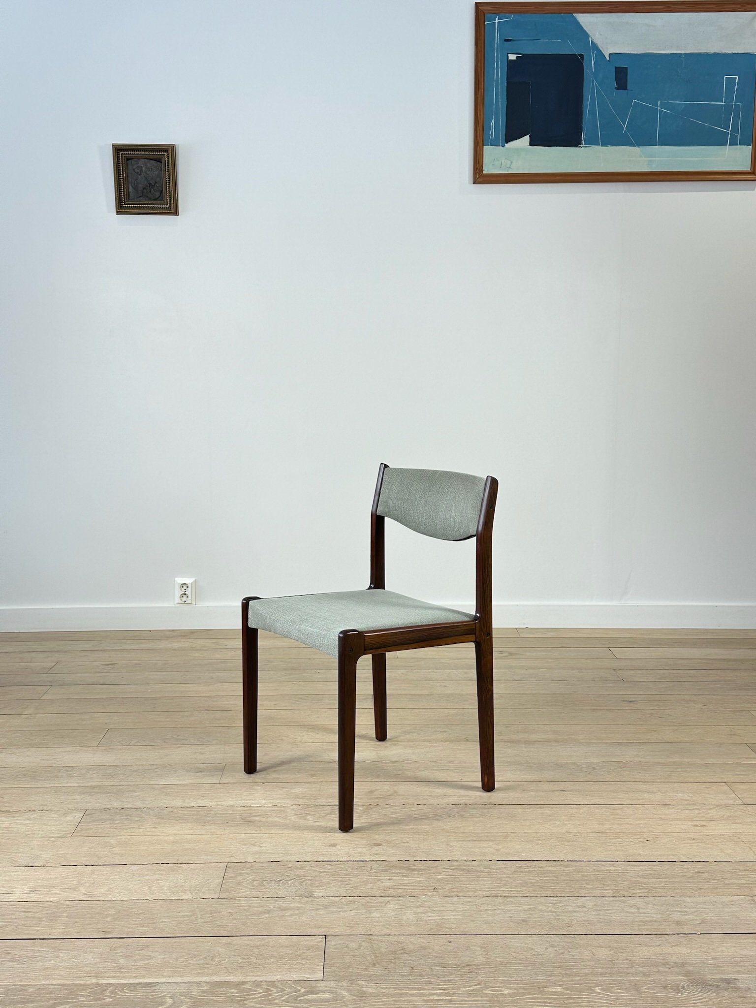 Elegant Danish dining chairs in rosewood, designed by Johannes Andersen and produced by Uldum Møbelfabrik in the 1960s. The chairs have been restored, and the seats have been reupholstered in beautiful grey fabric.