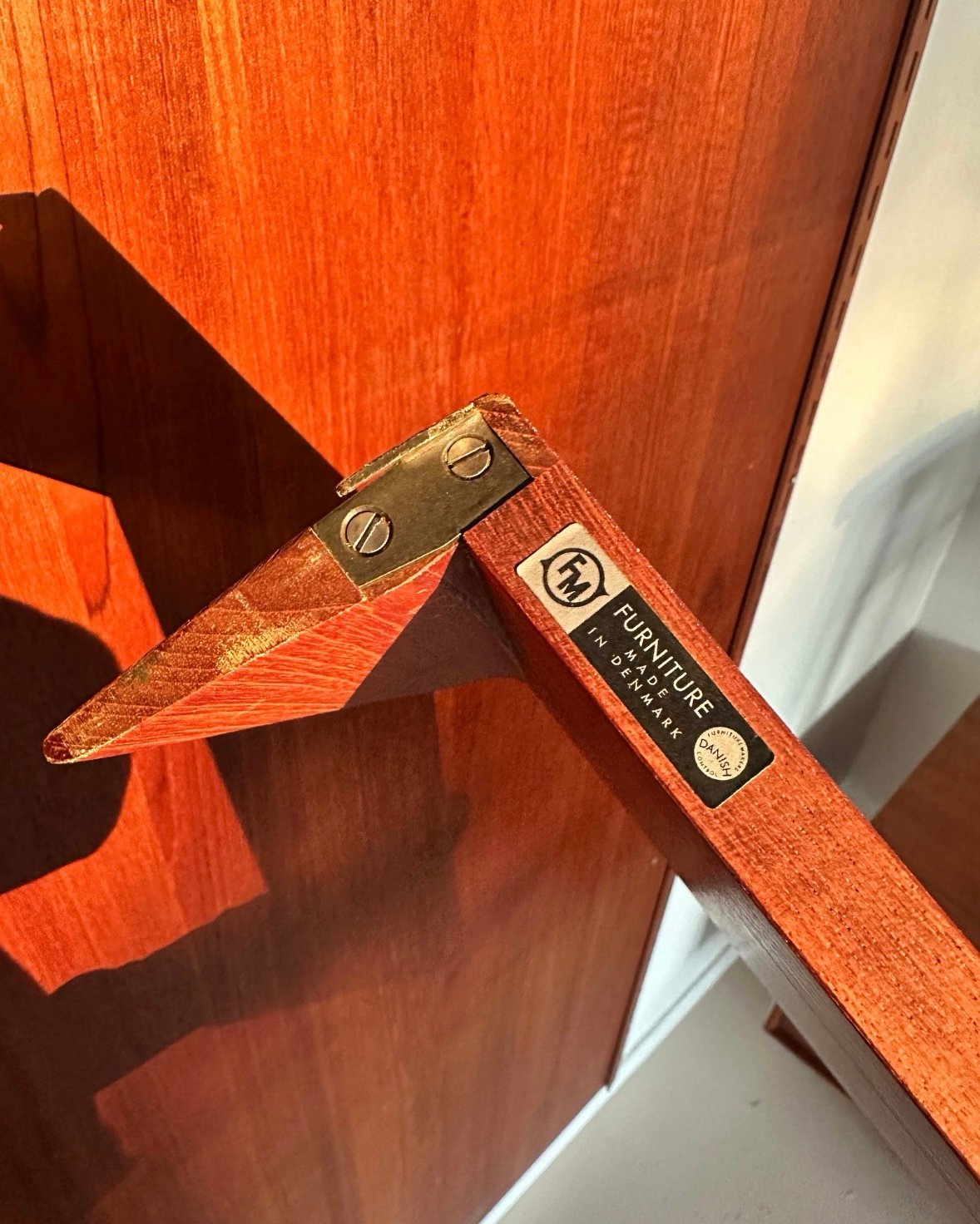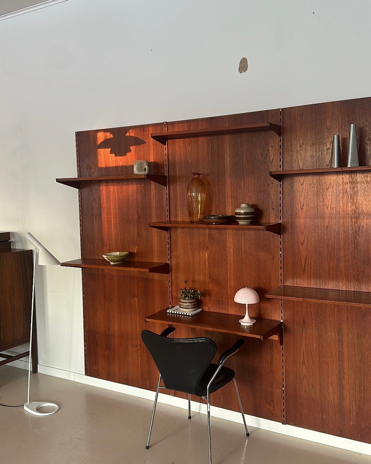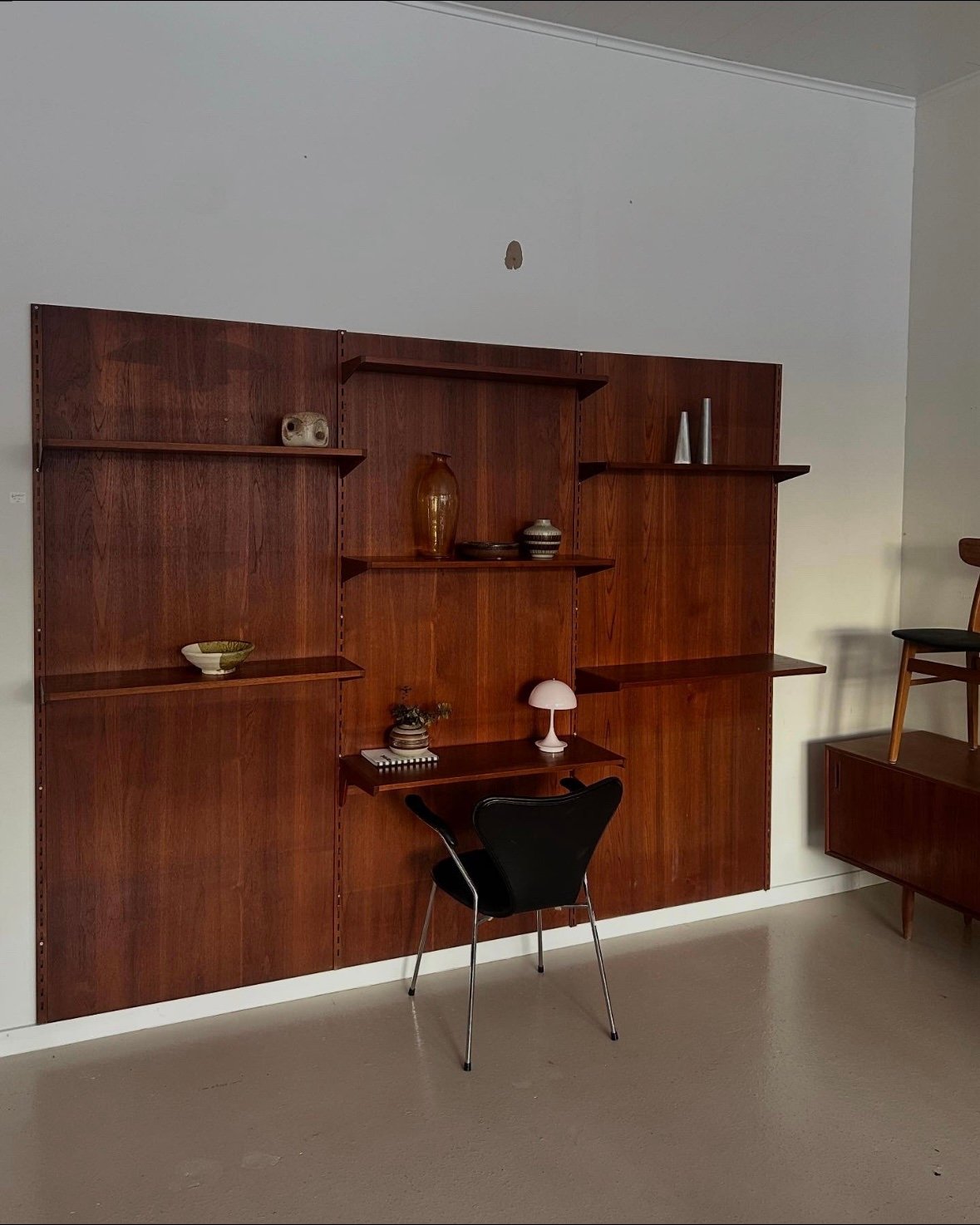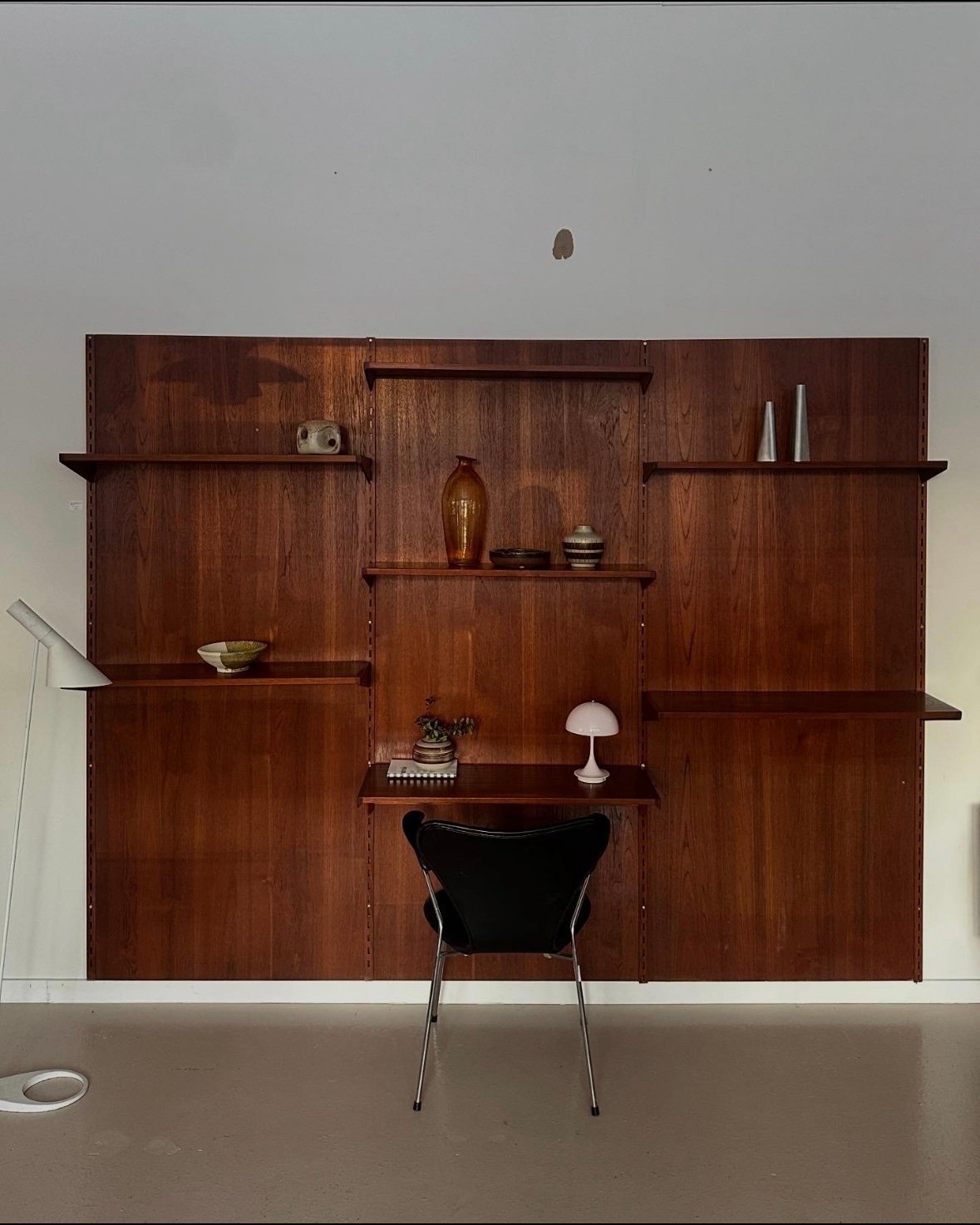A stunning Danish teak shelving system from the 1960s, designed by the renowned Kai Kristiansen and produced by FM Møbler. The set includes 3 wall panels that are screwed to the wall and 7 adjustable shelves. Various cabinet and display options are also available.