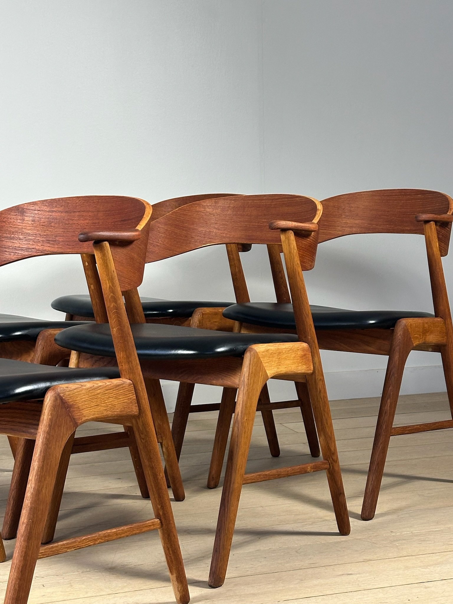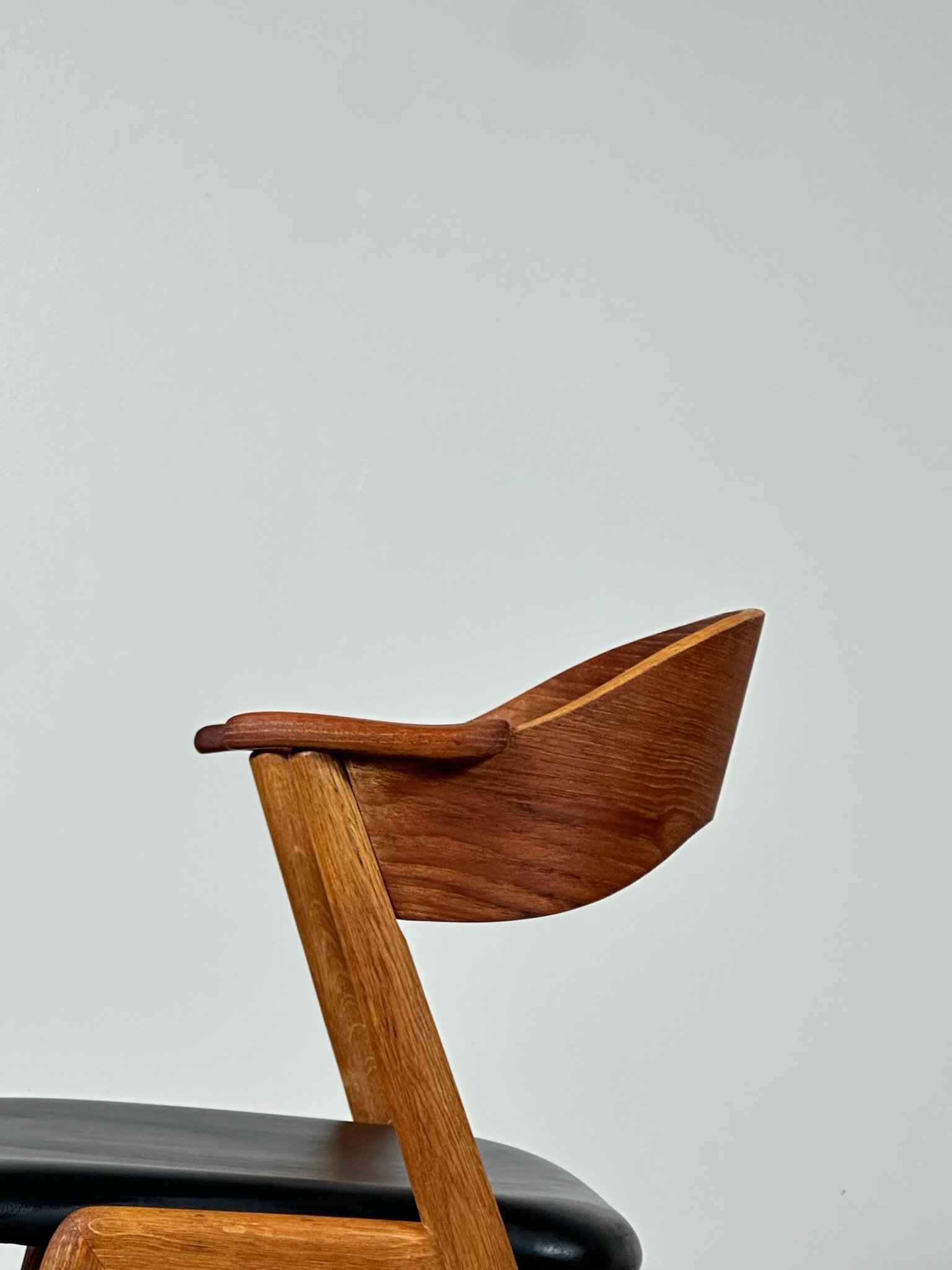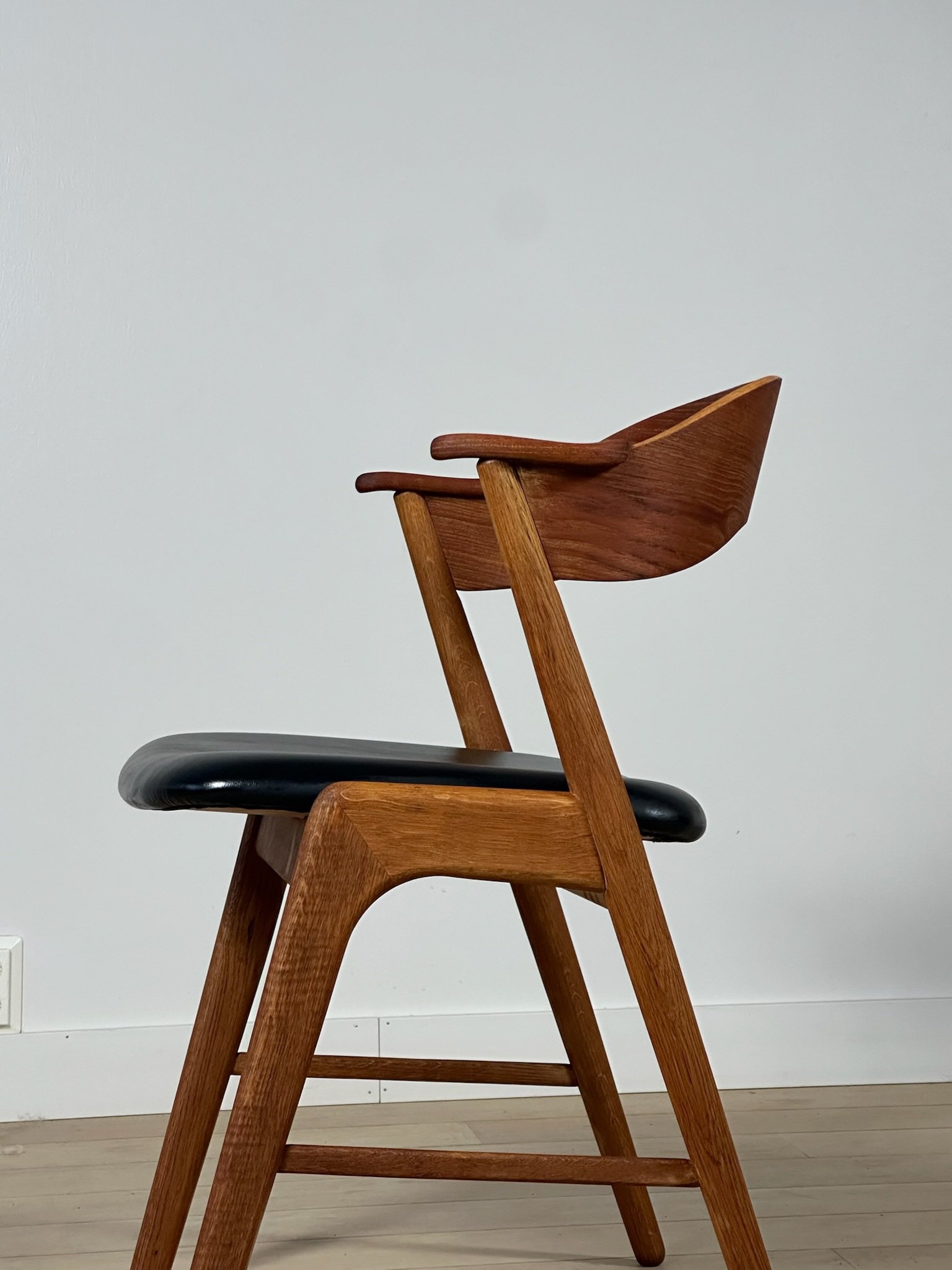 Stunning Danish dining chairs designed by Kai Kristiansen and produced by Korup Stolefabrik in the 1960s, made in oak and teak. The chairs have been fully restored, with seats reupholstered in elegant black faux leather. Price per chair. A total of 4 chairs available.