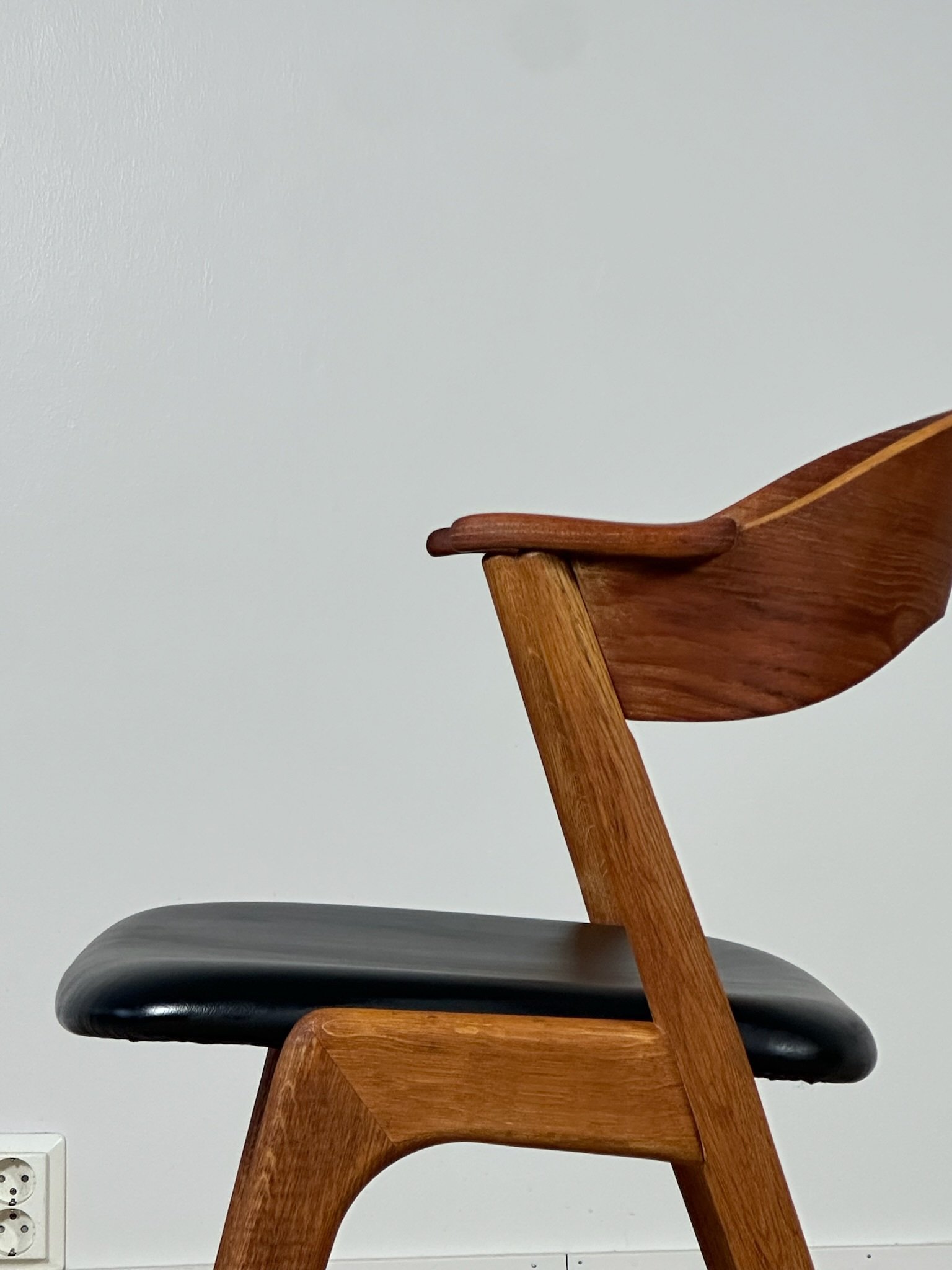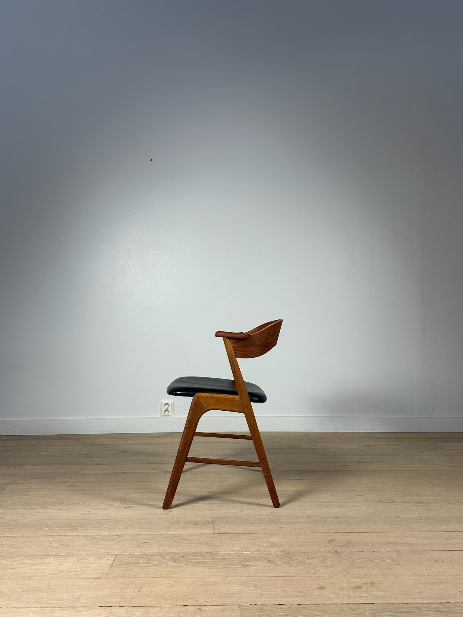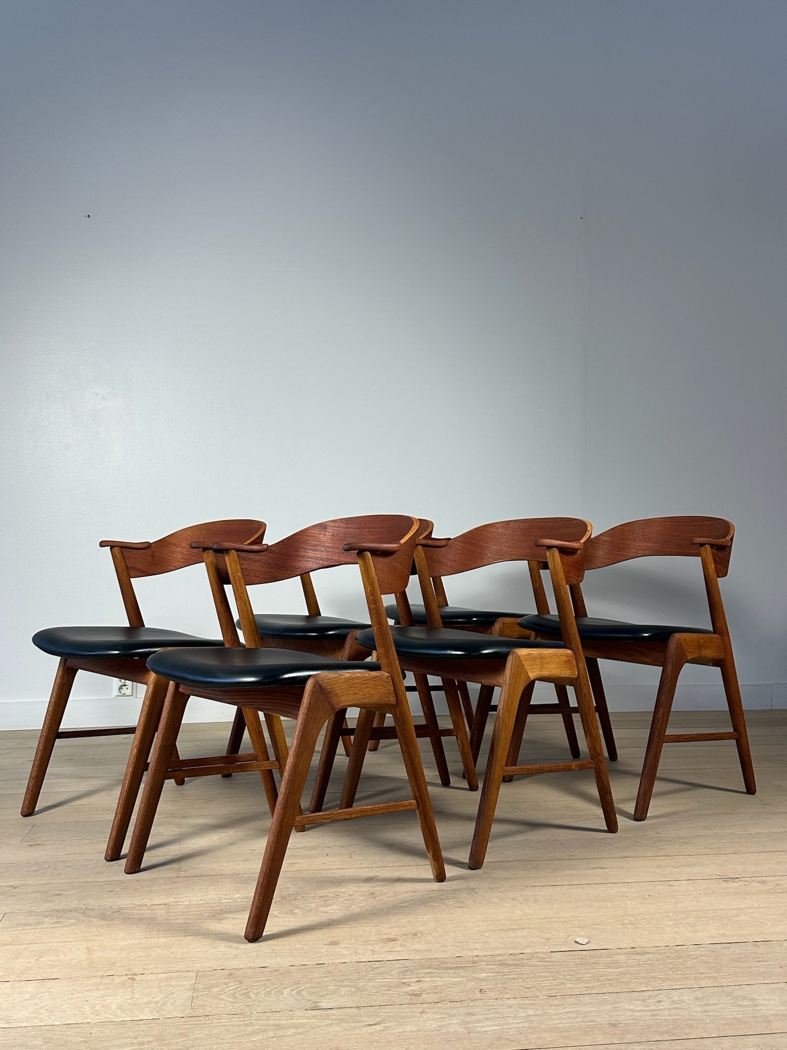 Stunning Danish dining chairs designed by Kai Kristiansen and produced by Korup Stolefabrik in the 1960s, made in oak and teak. The chairs have been fully restored, with seats reupholstered in elegant black faux leather. Price per chair. A total of 4 chairs available.