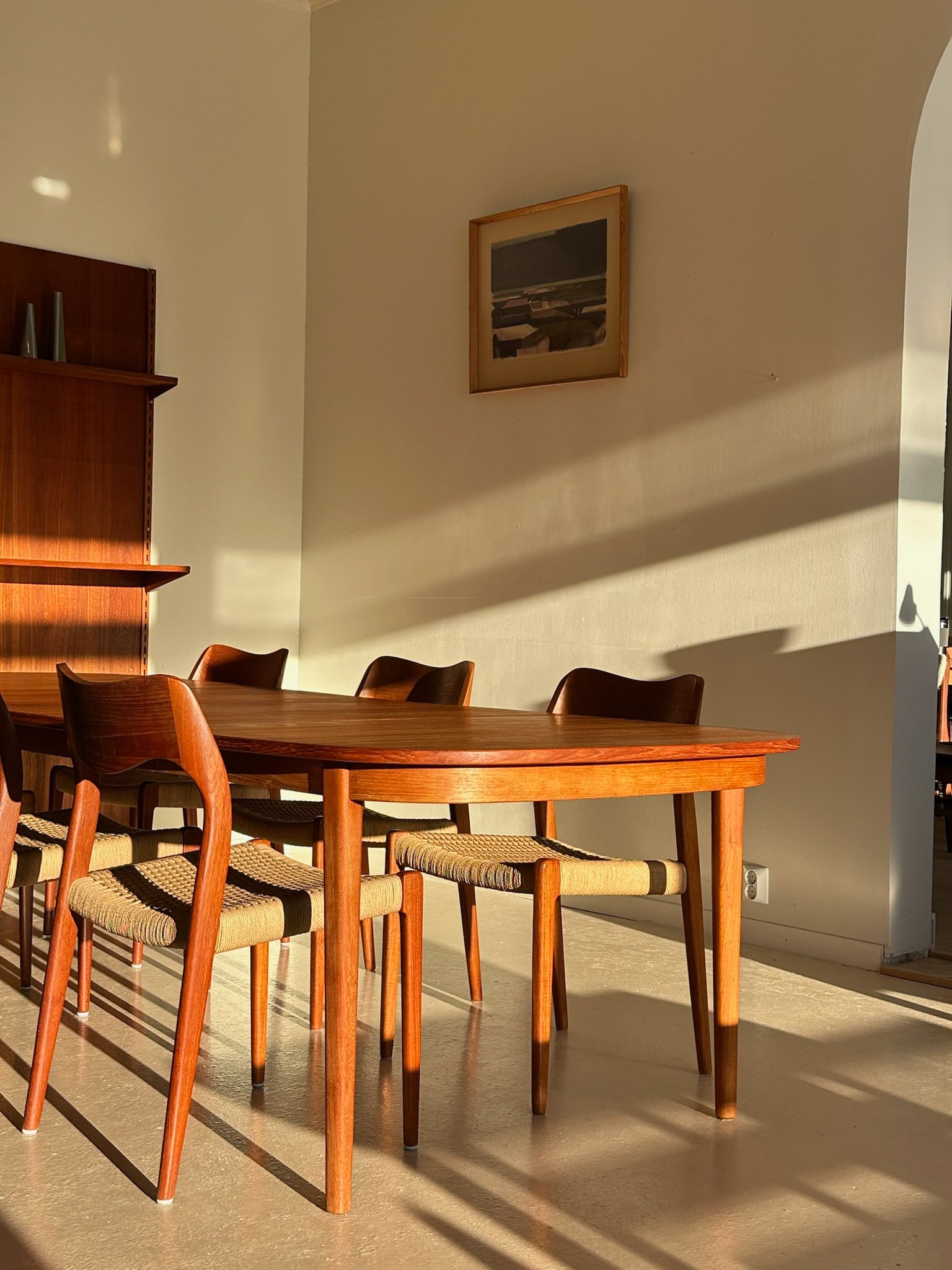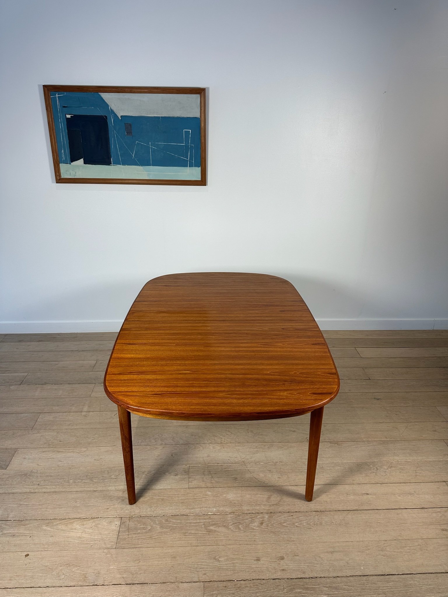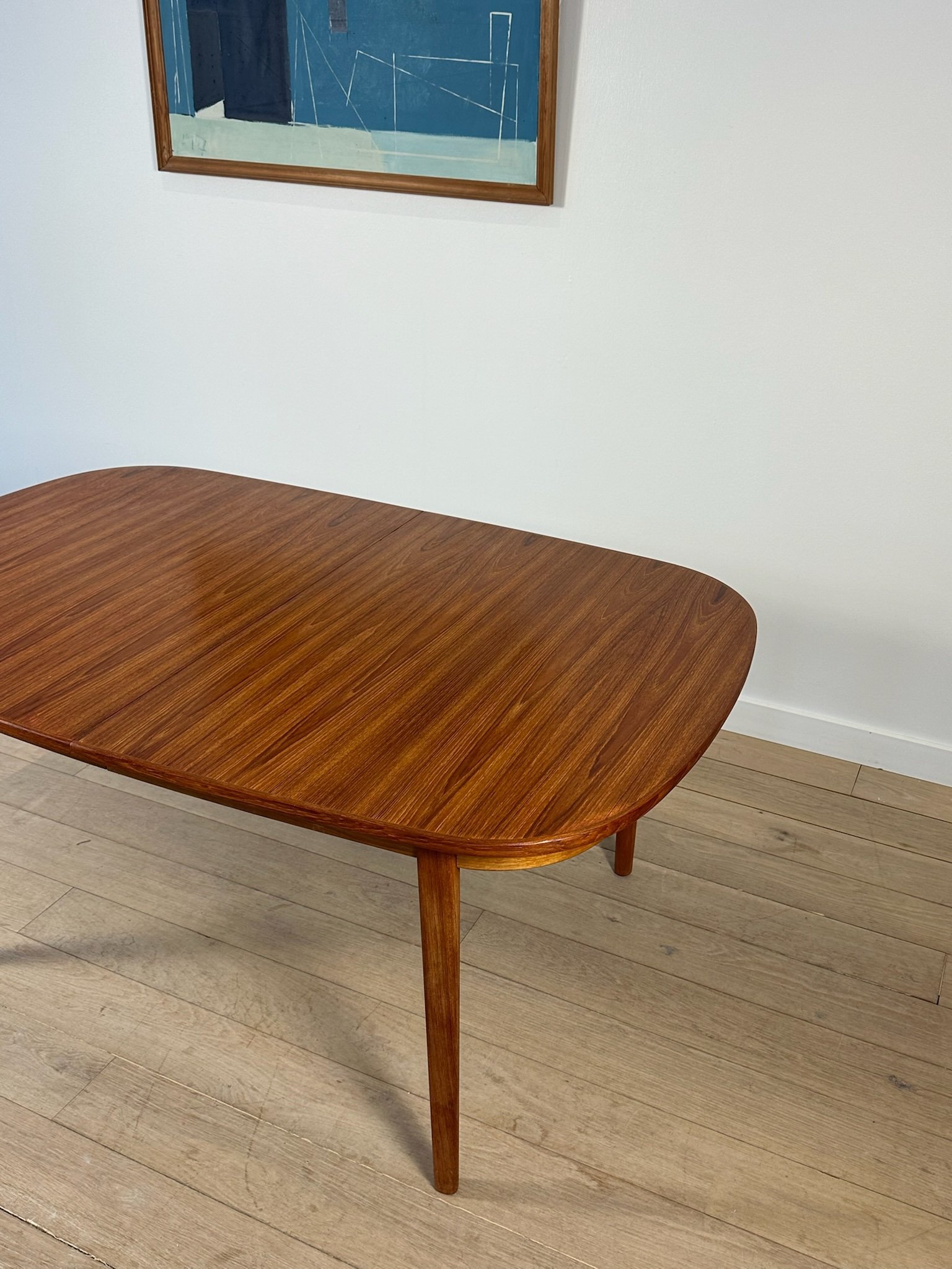 A long, straight, and relatively narrow Danish teak dining table from the 1960s with rounded corners. The table has been restored and is in excellent condition.