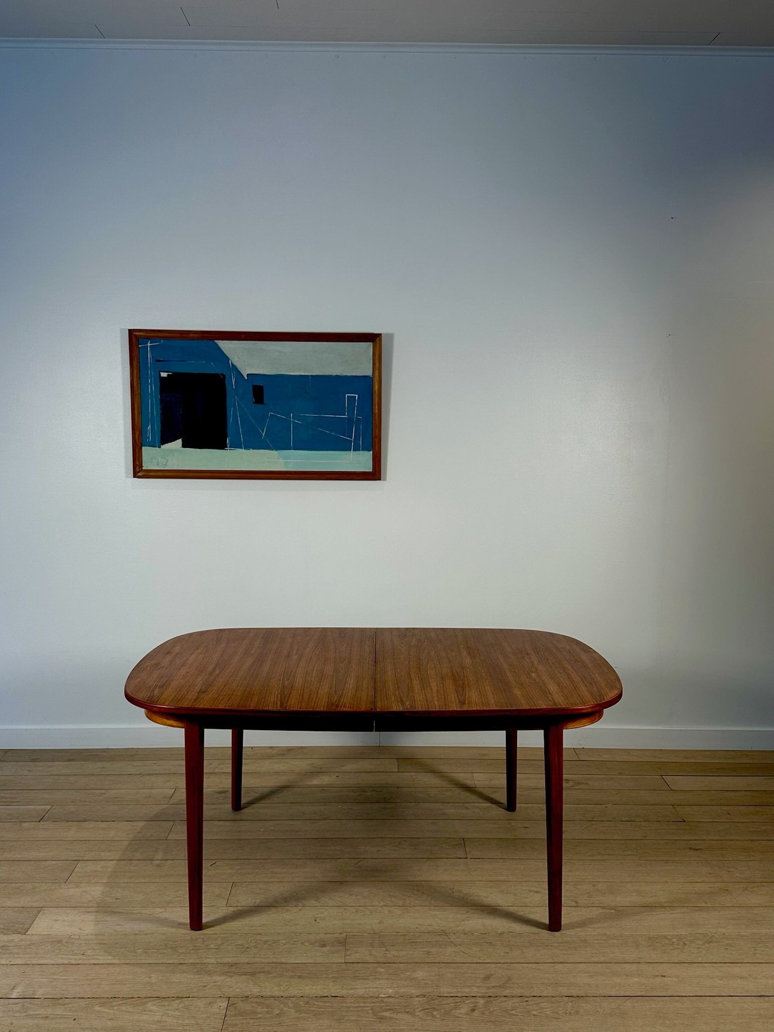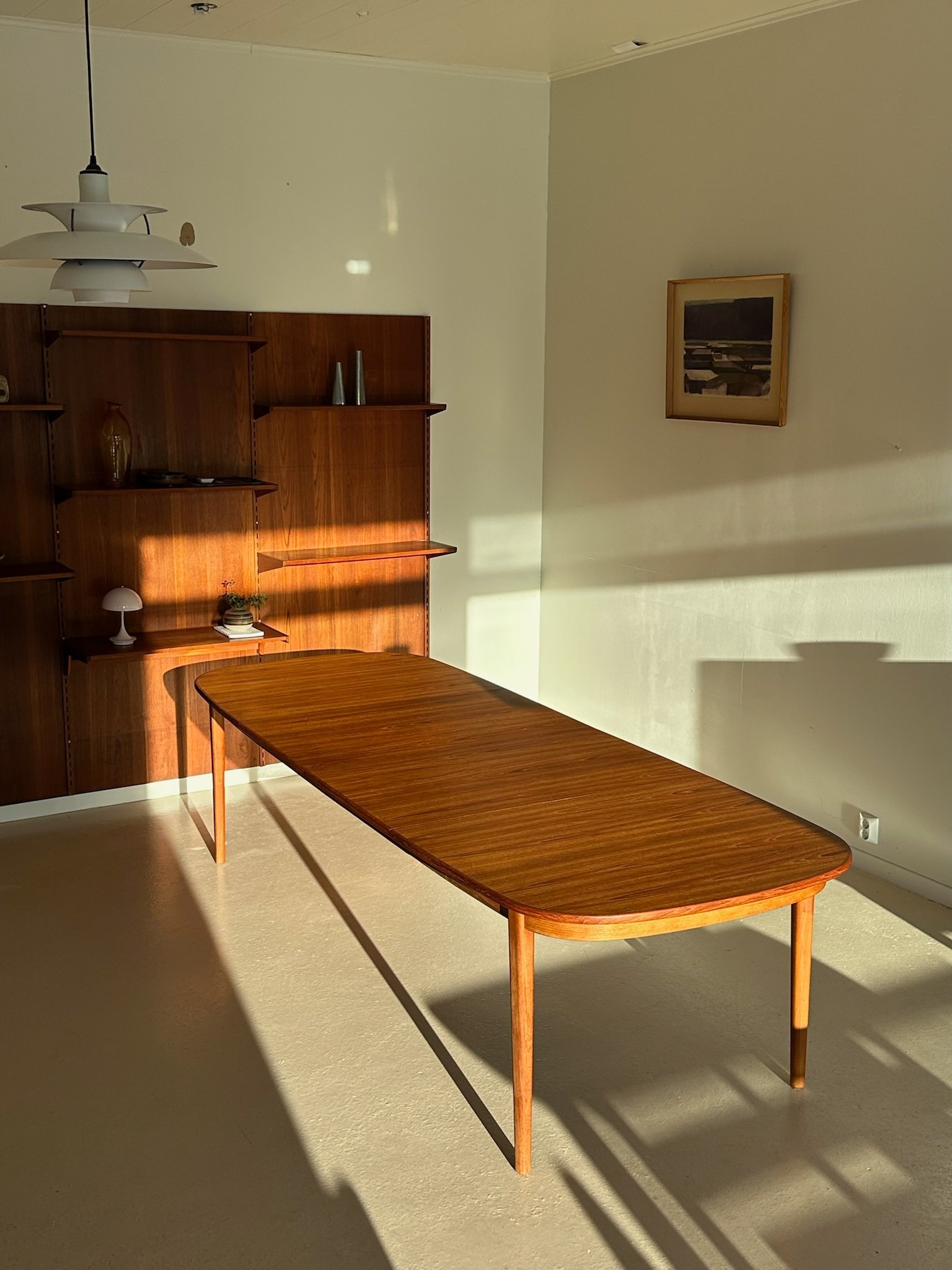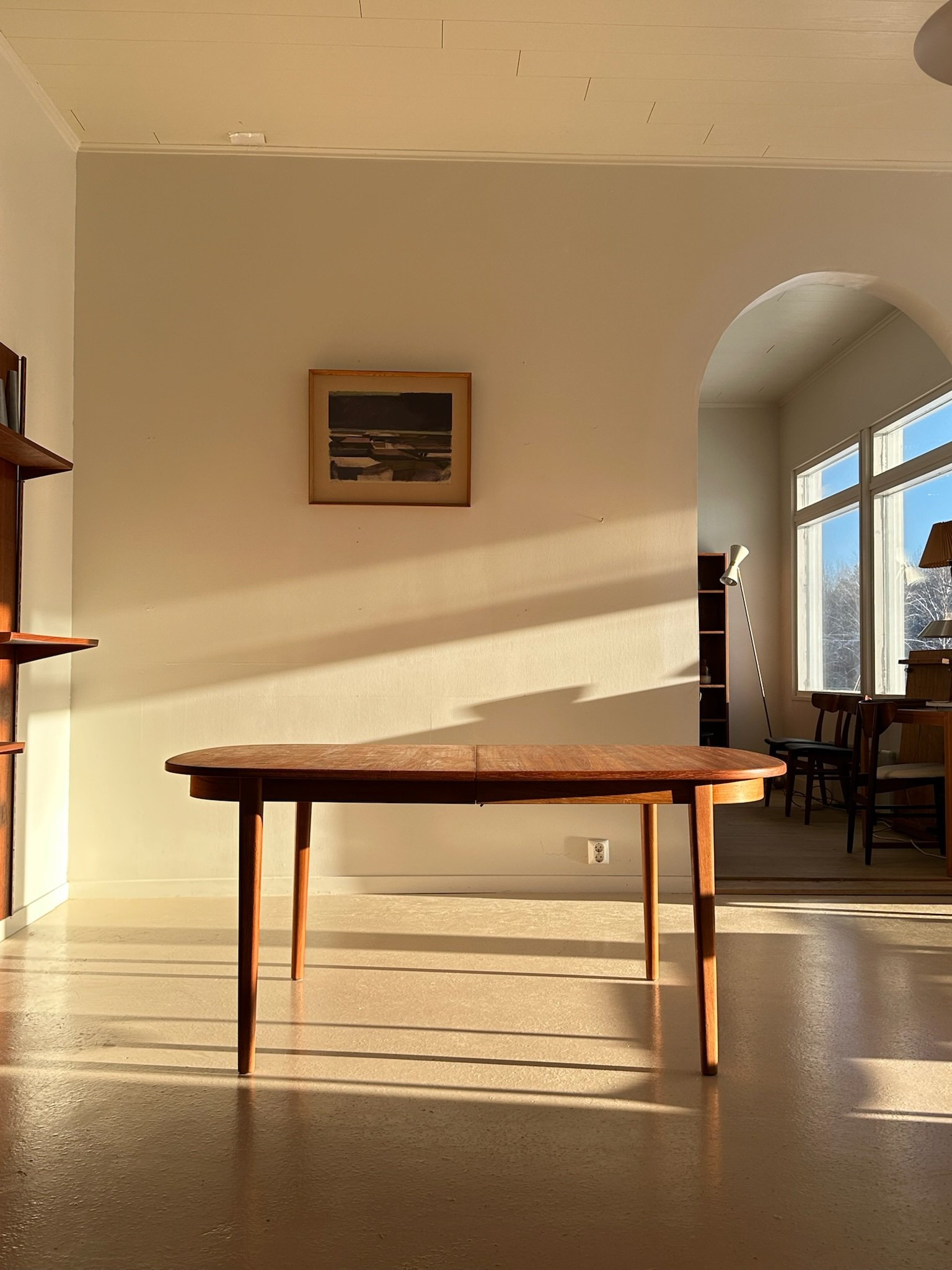 A long, straight, and relatively narrow Danish teak dining table from the 1960s with rounded corners. The table has been restored and is in excellent condition.