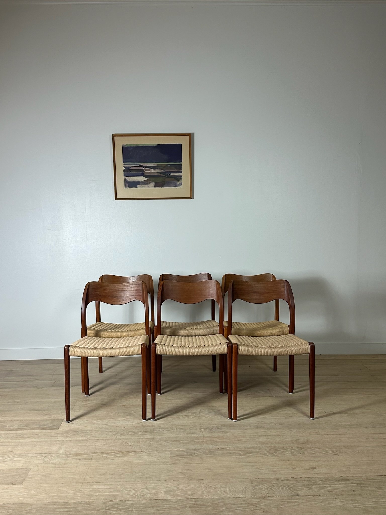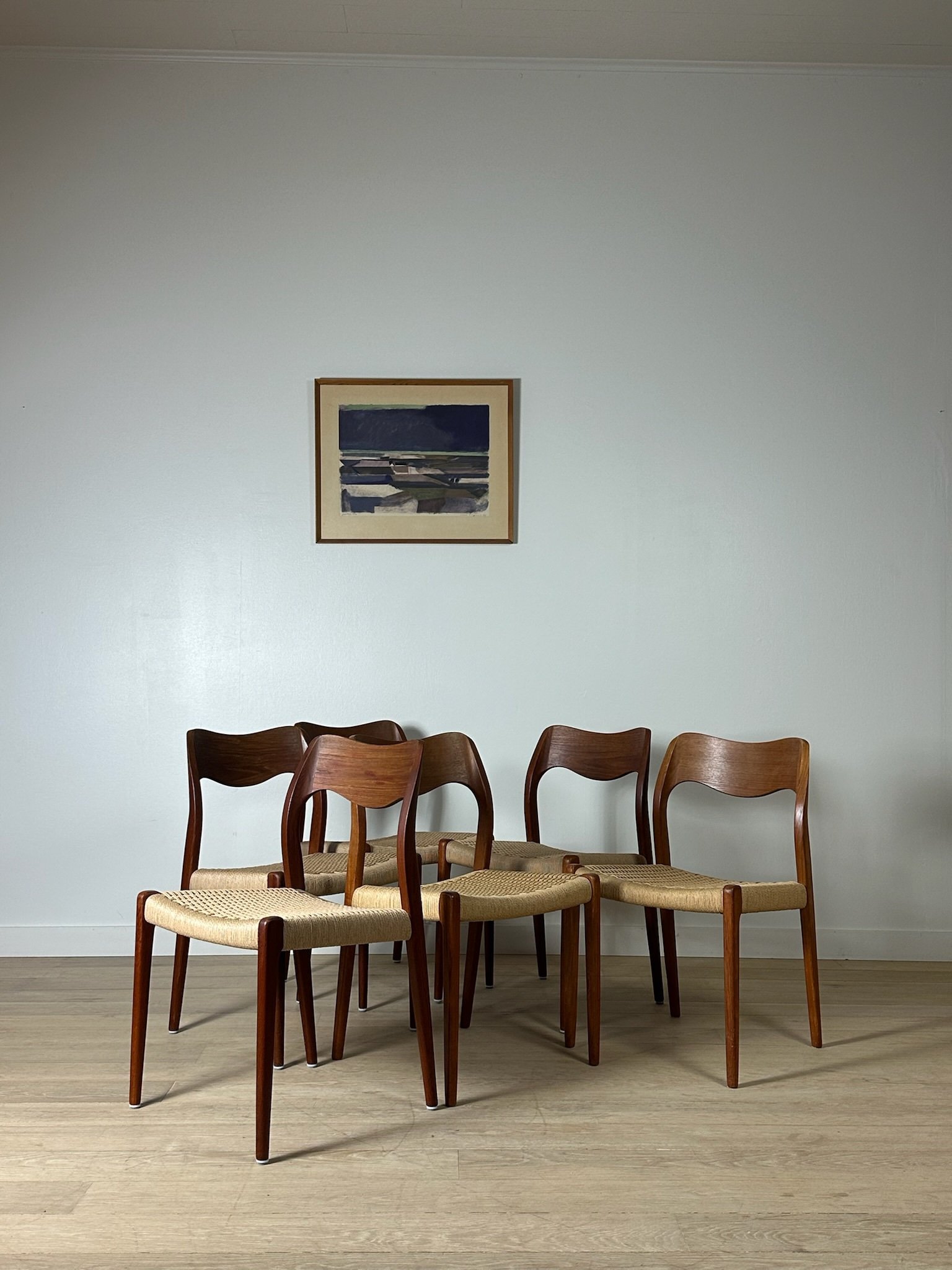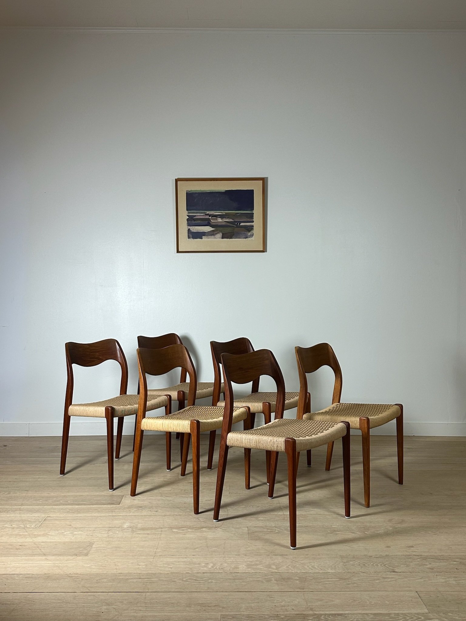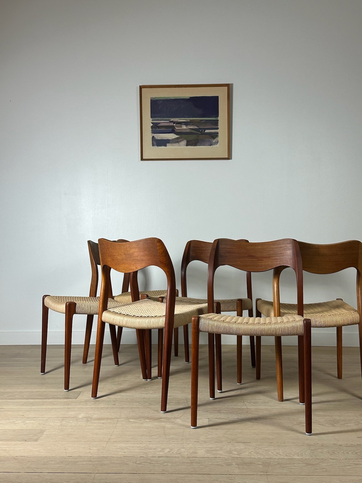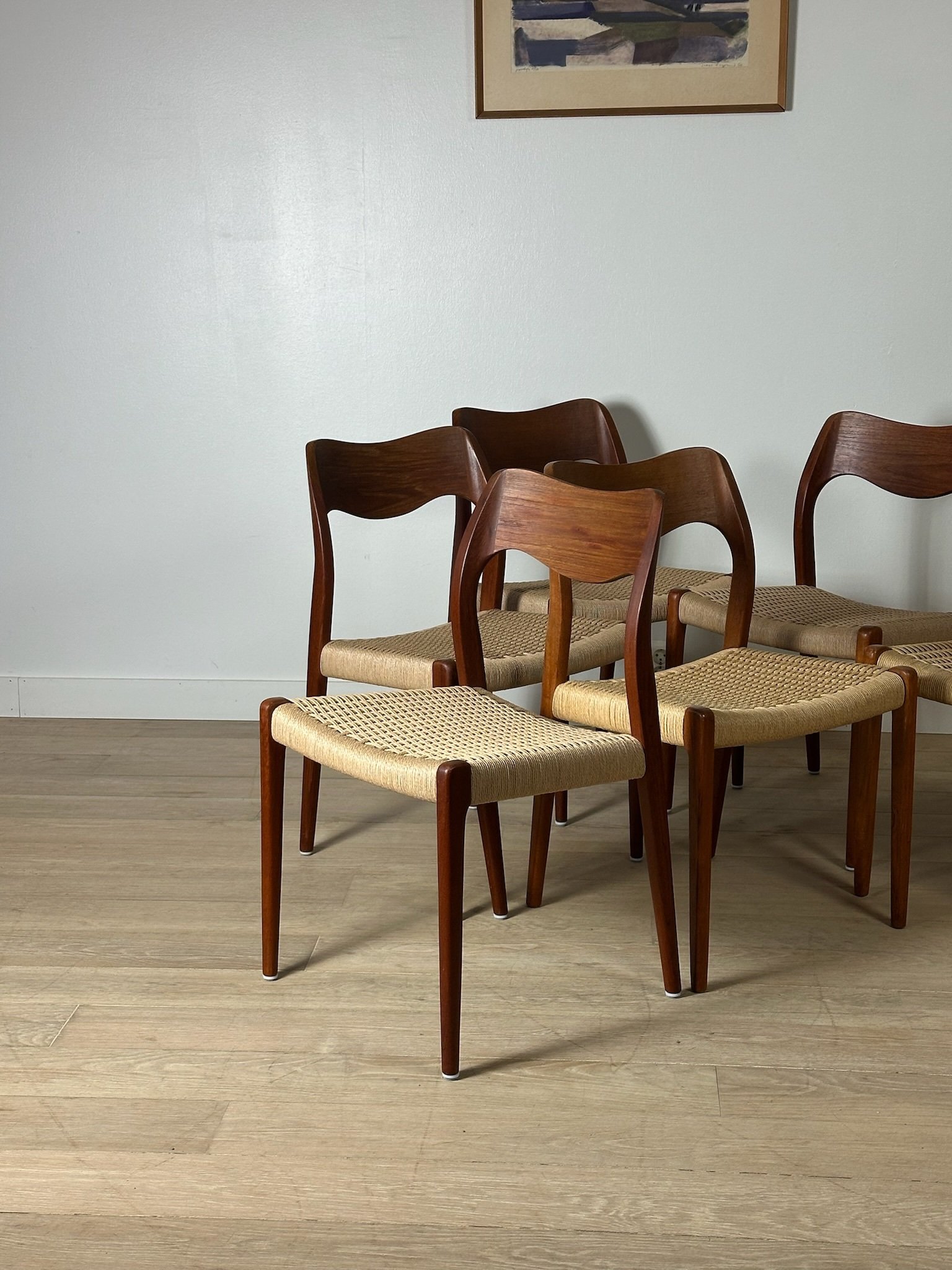 Iconic Model 71 dining chairs from Denmark, designed by Niels Otto Møller and produced by J.L. Møllers Stolefabrik.