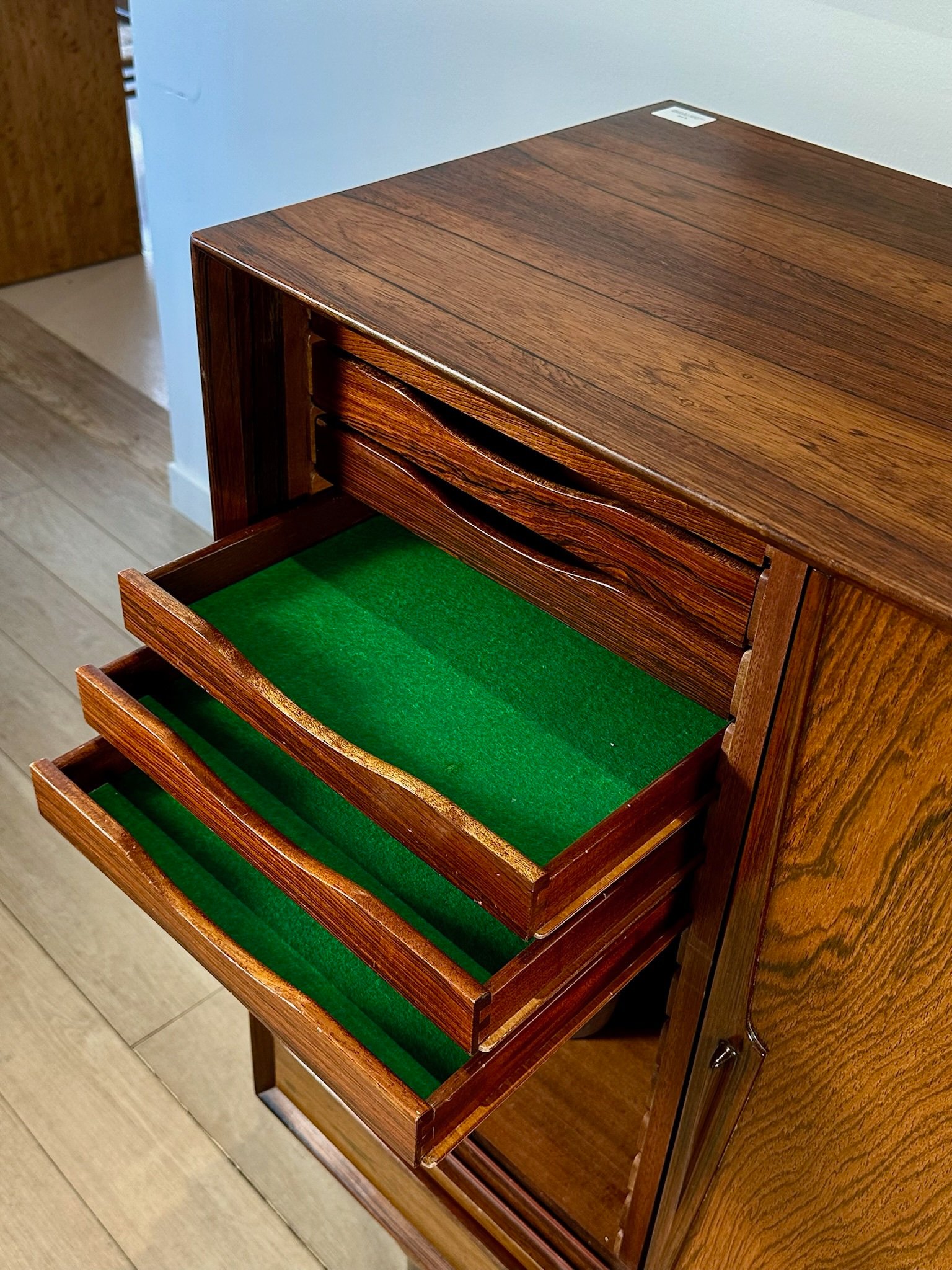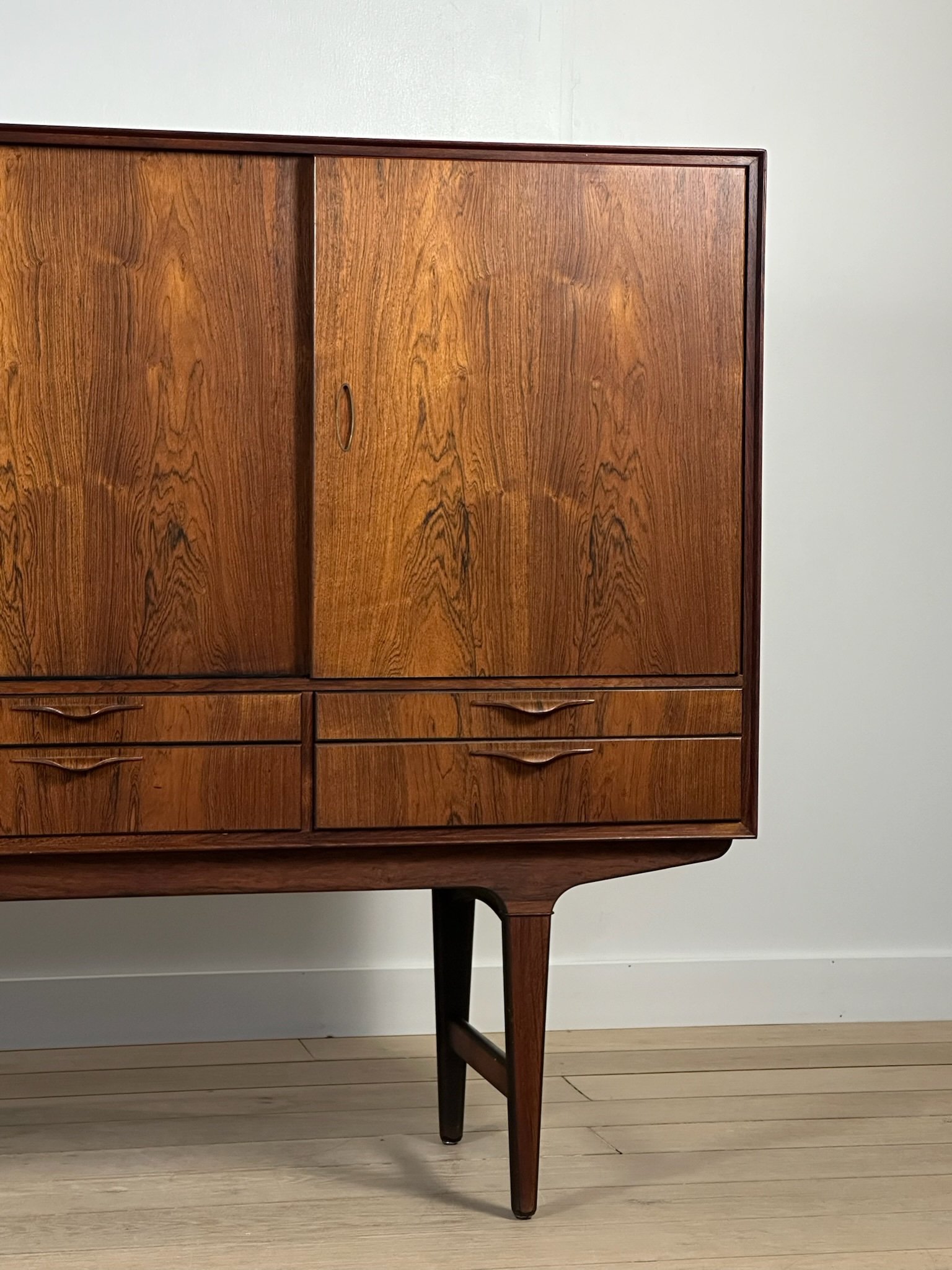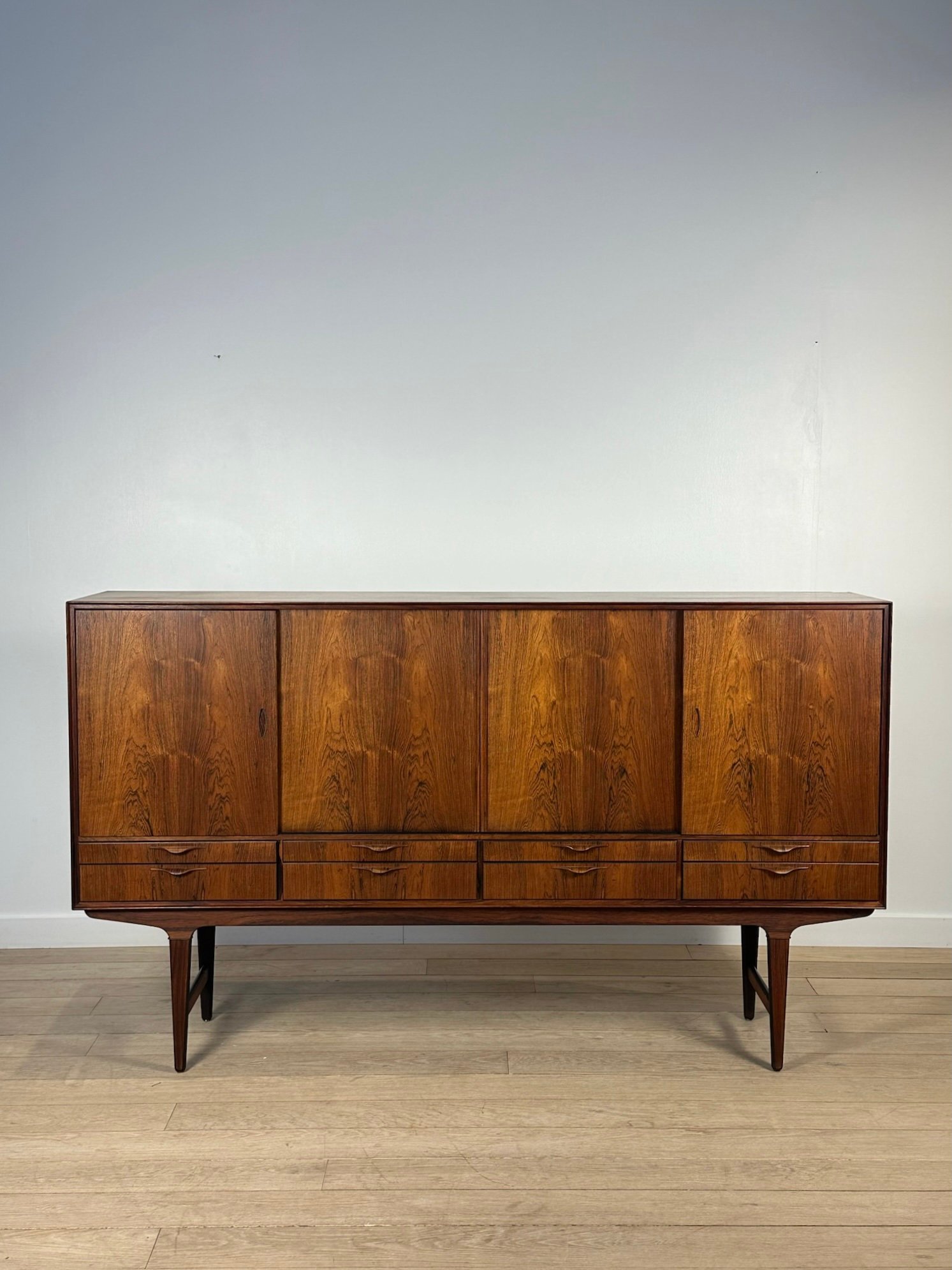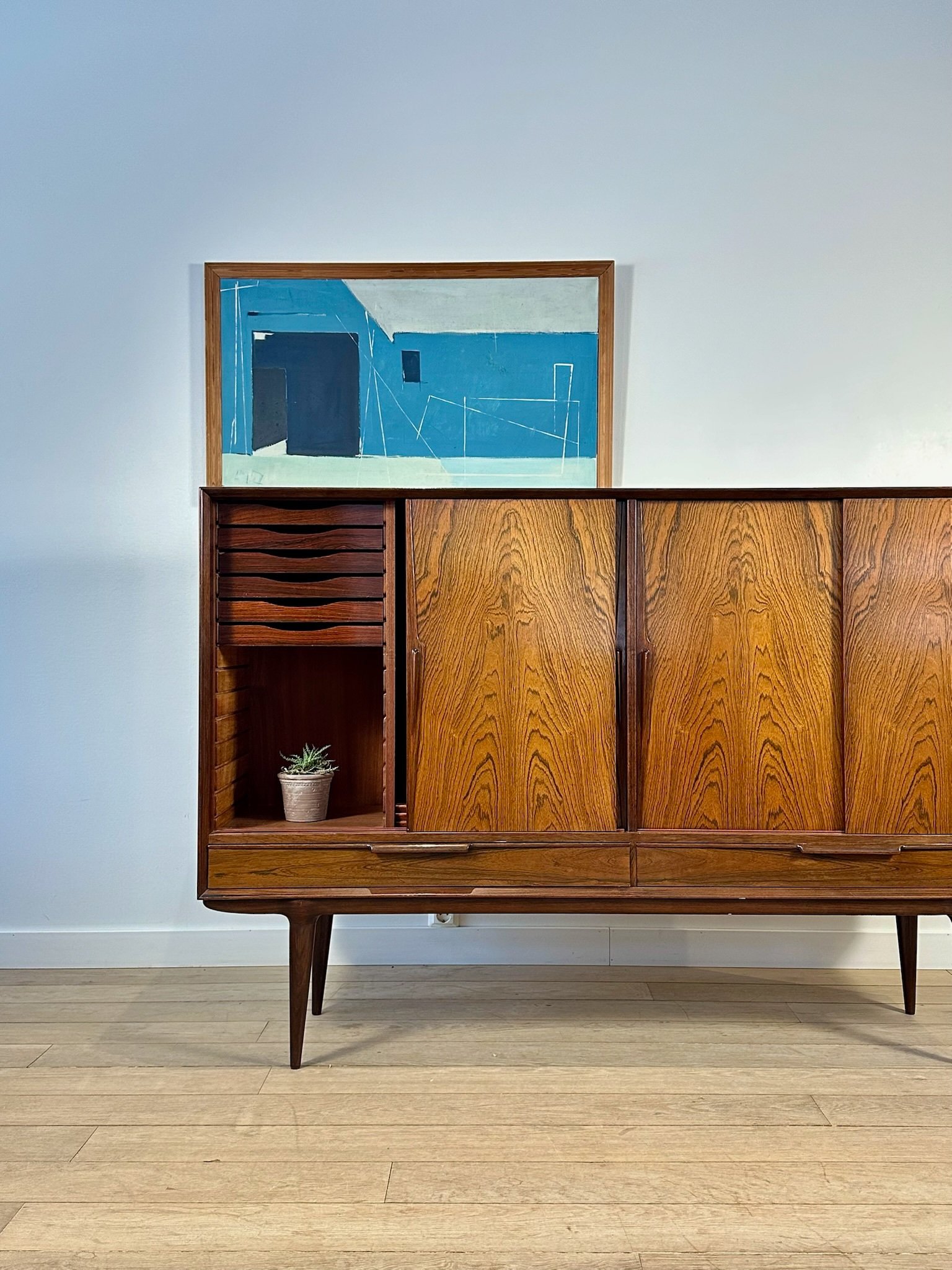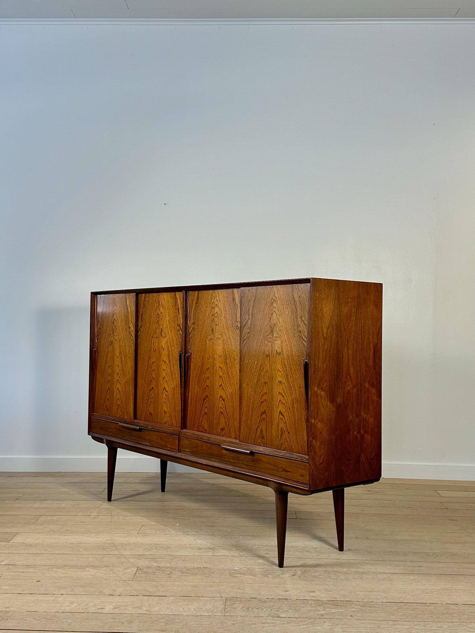 A stunning tall sideboard/cabinet from the 1960s, produced by the Danish manufacturer Omann Jun Møbelfabrik. The sideboard features internal shelves and drawers. It has been restored and is in excellent condition.