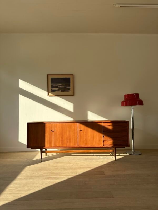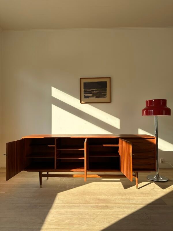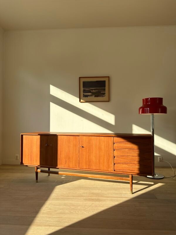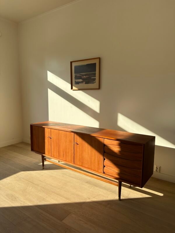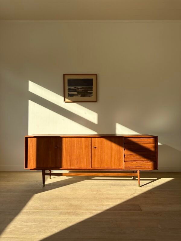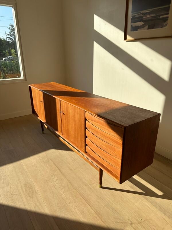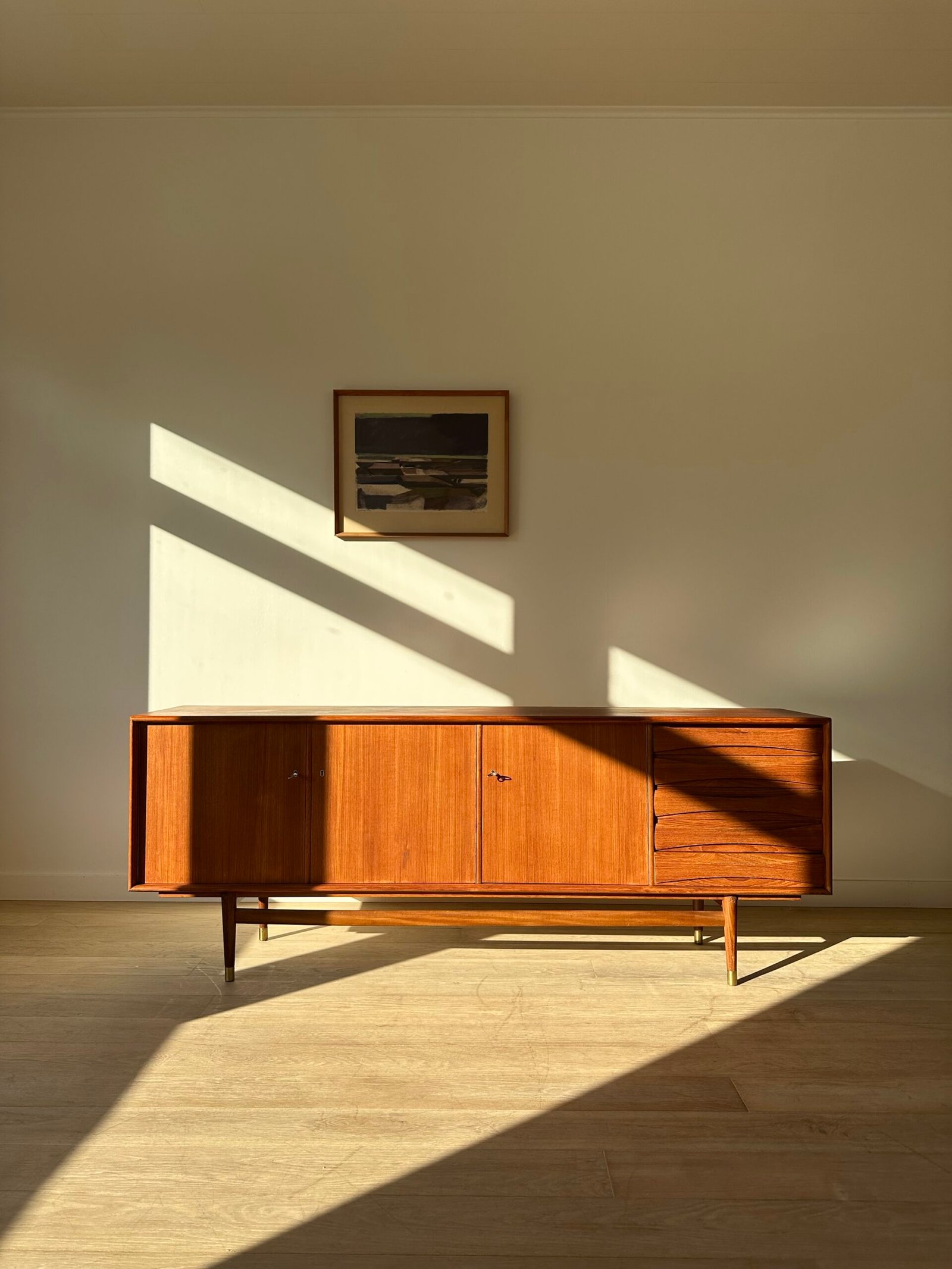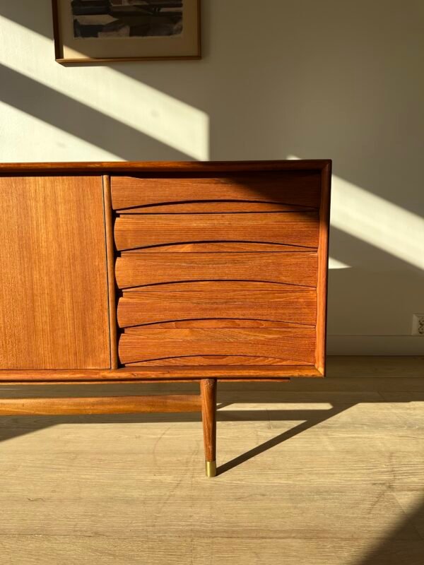 A stunning 2-meter-long Norwegian teak sideboard from the 1960s, designed by Sven Andersen. The sideboard features pull-out drawers, internal shelves, functional locks, and brass leg details. It is in excellent condition.